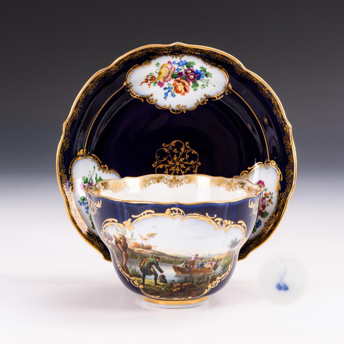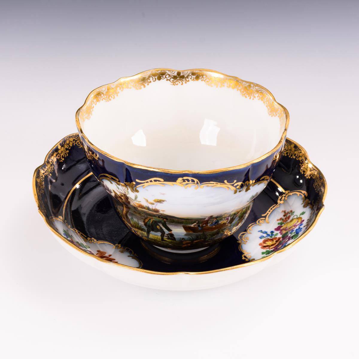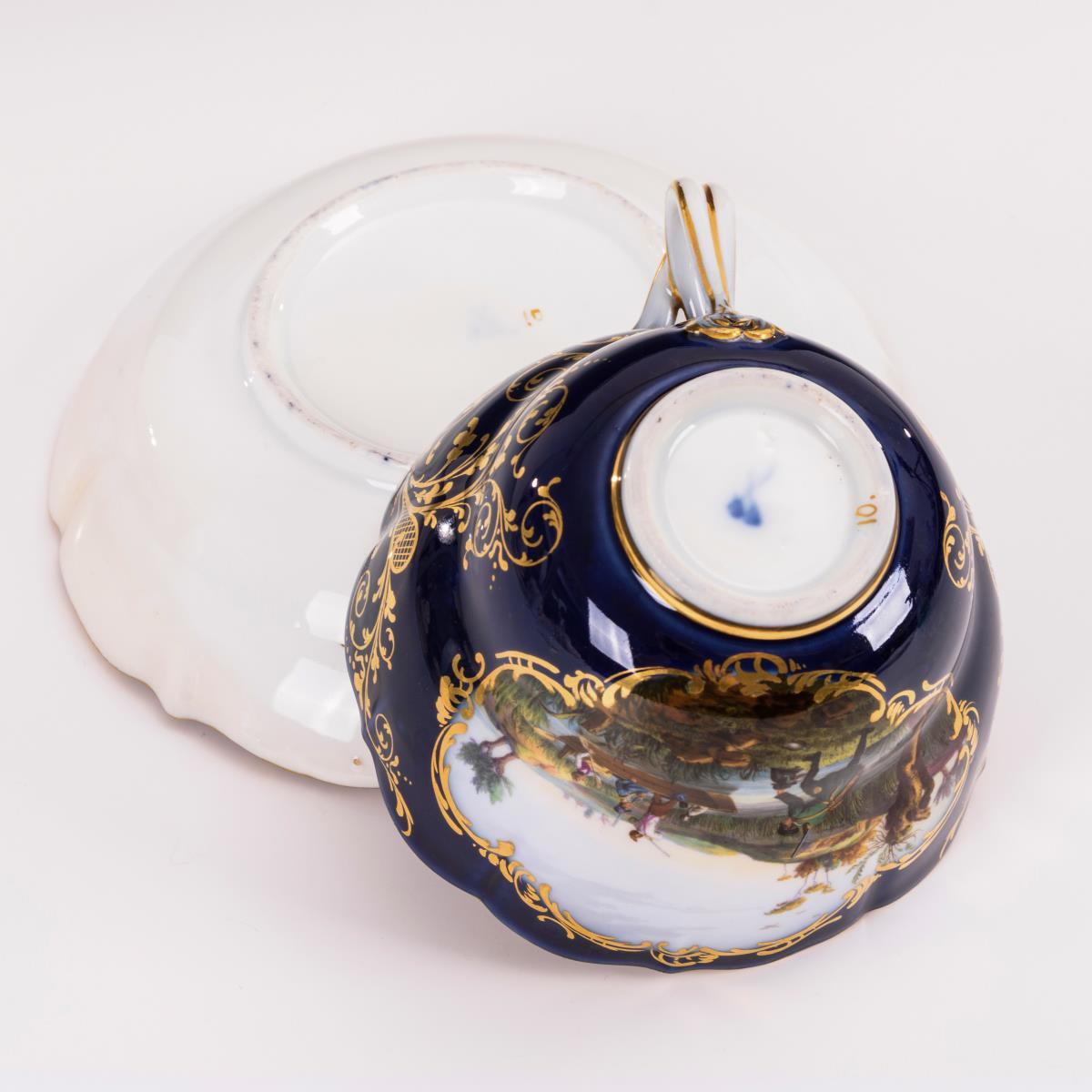 Kobaltblauer Fond, polychrome Malerei, reiche Goldstaffage. H Tasse 8 cm, Ø originaler Untertasse 17,5 cm.