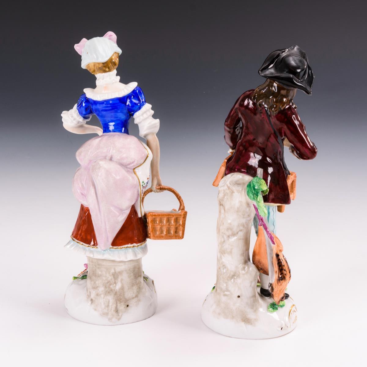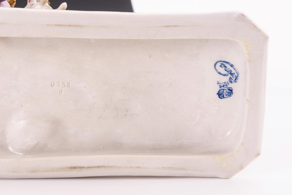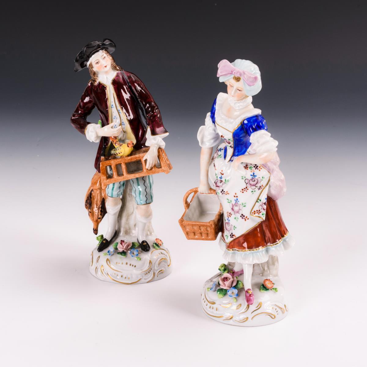 1x Müller/Schwarza-Saale: zur Musik eines flötespielenden Knaben einen Reigen tanzende Kindergruppe (L 28 cm). / 1x Sitzendorf: Vogelhändler (H 18 cm) und Frau mit Korb (H 18 cm). Gold partiell berieben, Blüten der Kindergruppe partiell bestoßen, 1 Vogel sowie 1 Finger des Vogelhändlers bestoßen.