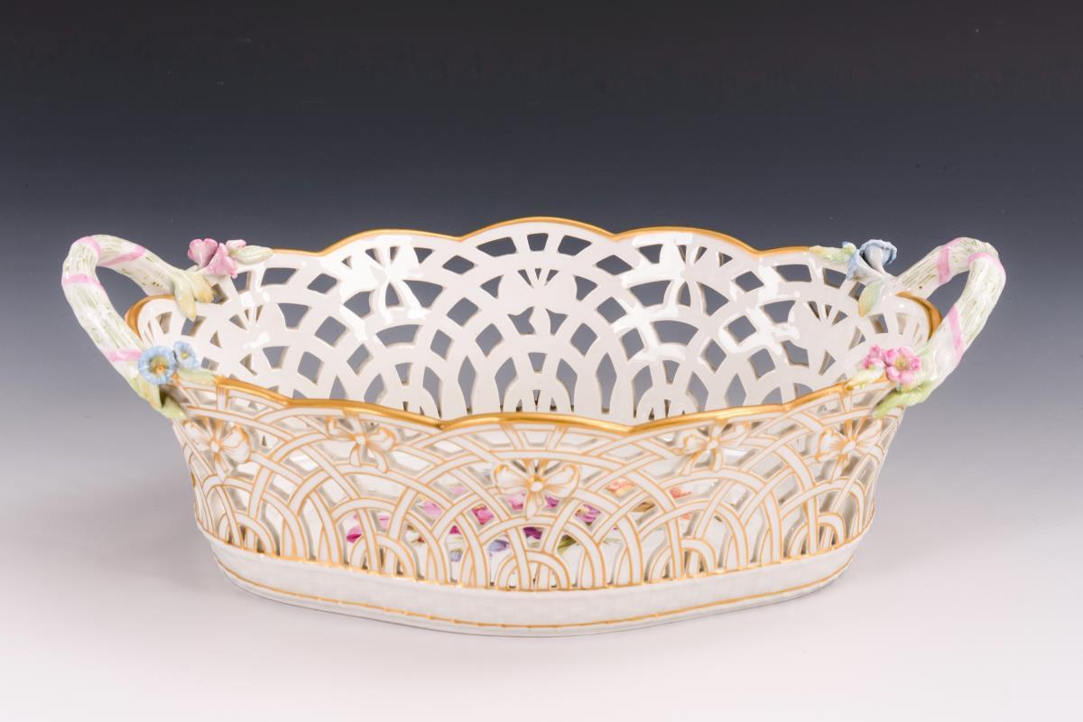 Ovaler Korb mit Blütenbesatz an den Asthenkeln, im Spiegel ein Blumenbukett.
