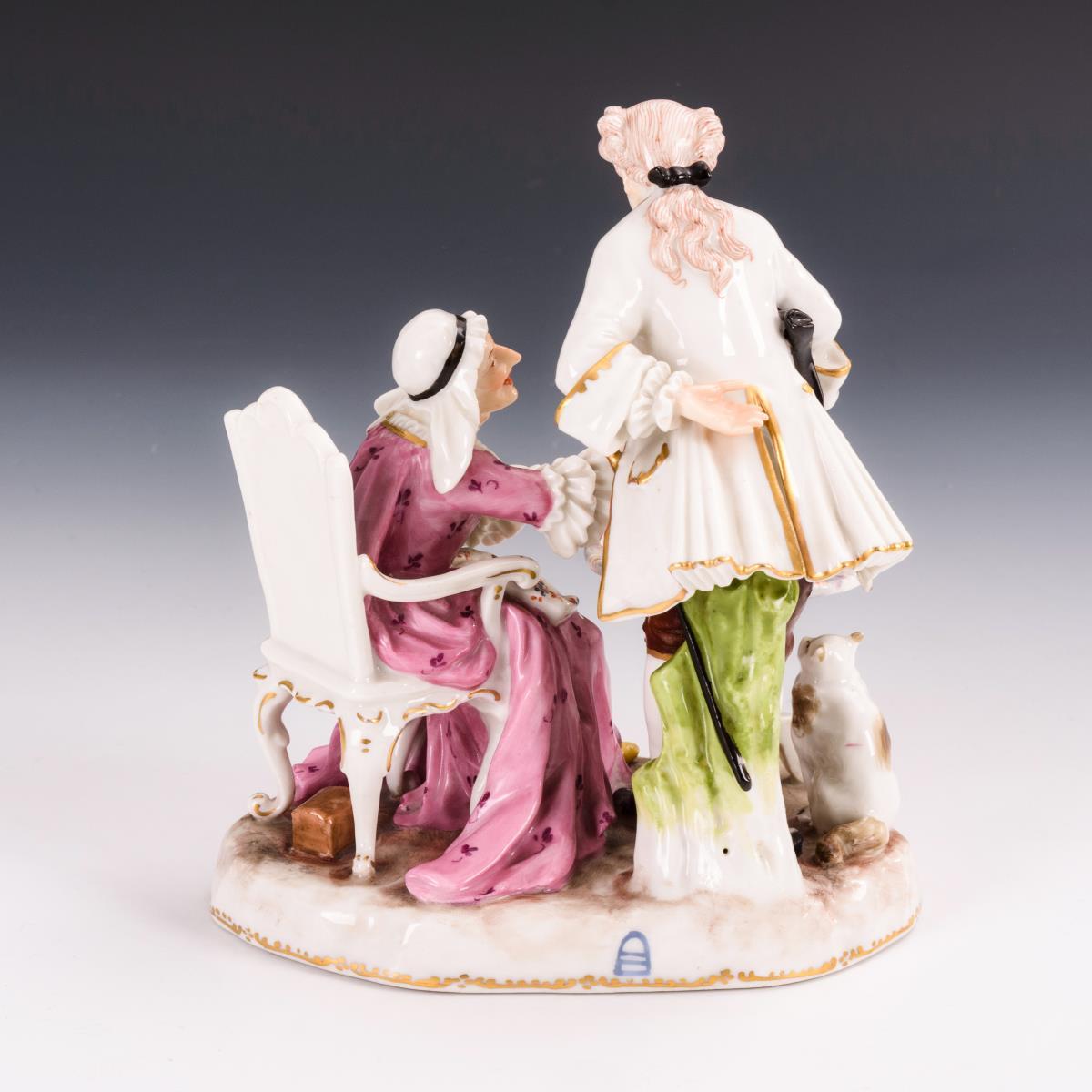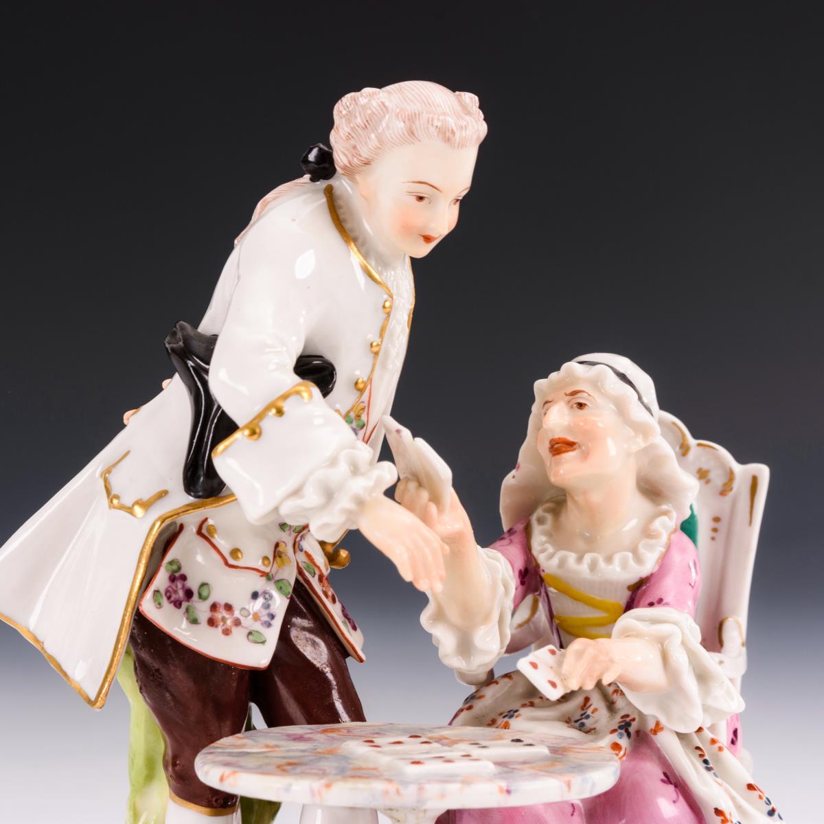 An einem Tisch sitzende, einem Kavalier die Karten legenden Wahrsagerin. Tisch geklebt.
