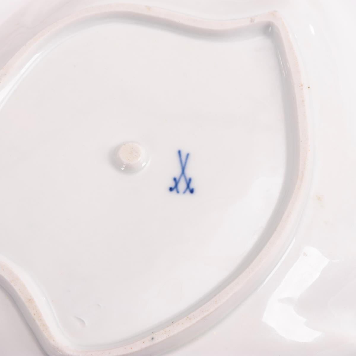 Form "Neuer Ausschnitt". Kaffeetasse, 3 + 1 Teller (Ø 3x 16 cm und 1x 20 cm), 1 Quadratschüssel (18 x 18 cm) und 1 Blattschale (L 22 cm). Bestoßung am Tassenrand.