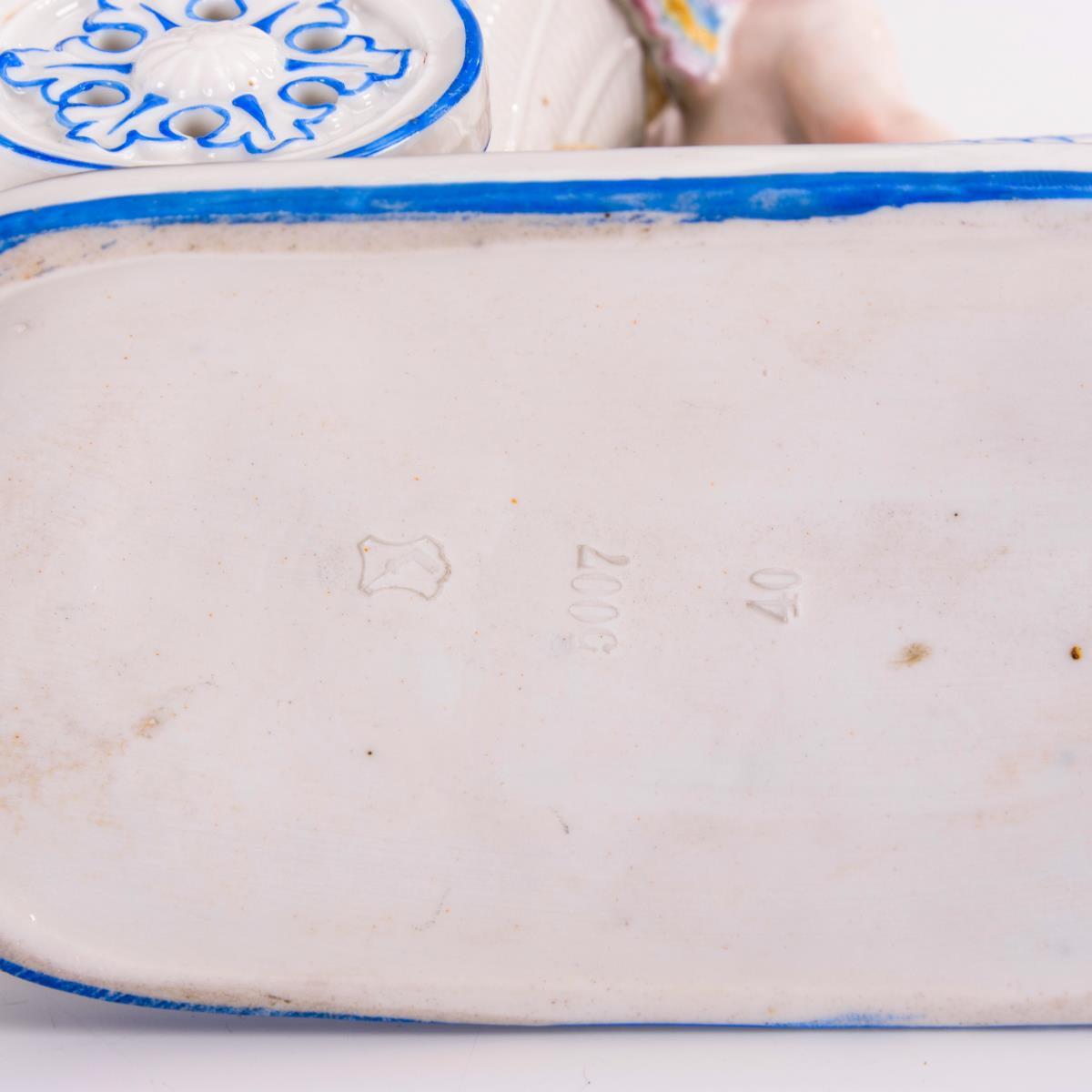 Putto mit einem Hundegespann und einem Korb als Vase. Blüten bestoßen.