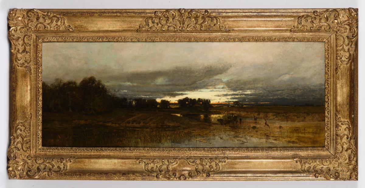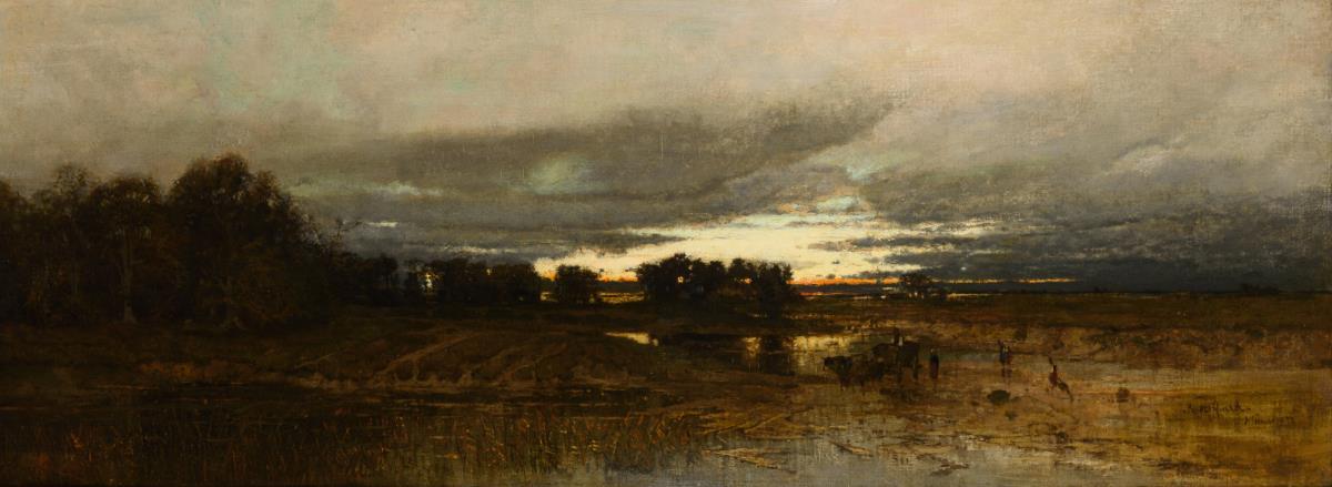 Abend in der weiten Moorlandschaft mit dem Bauernvolk unter wolkigem Himmel.