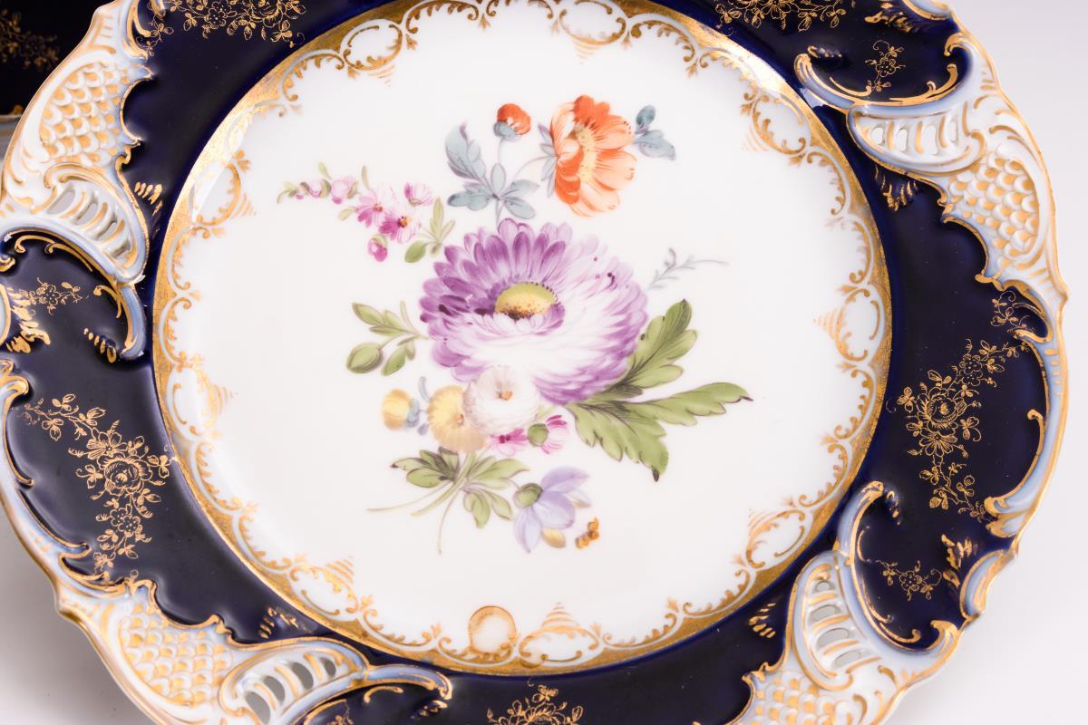 Kobaltblauer Teilfond, polychrome Blumenmalerei, Goldstaffage. Ø 21,5 cm.