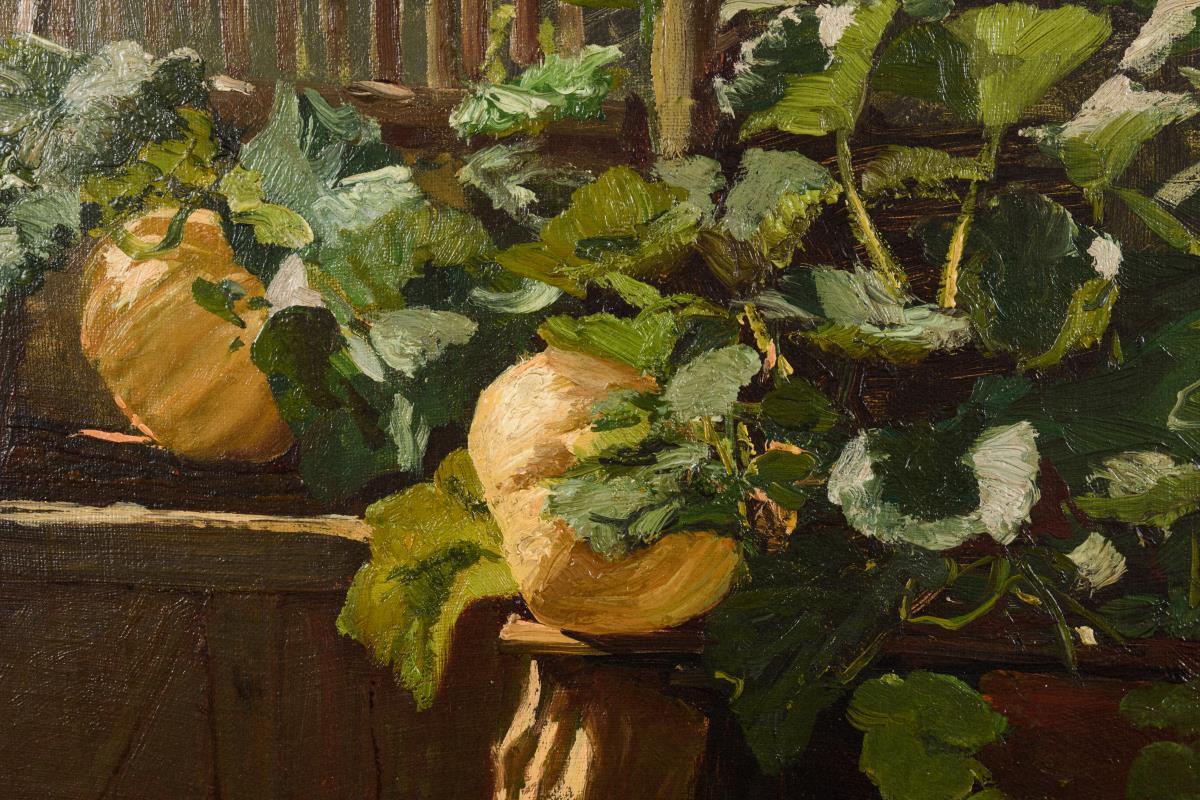 Hochbeete am Zaun mit den große Früchte tragenden Kürbisspflanzen im Sonnenschein.
