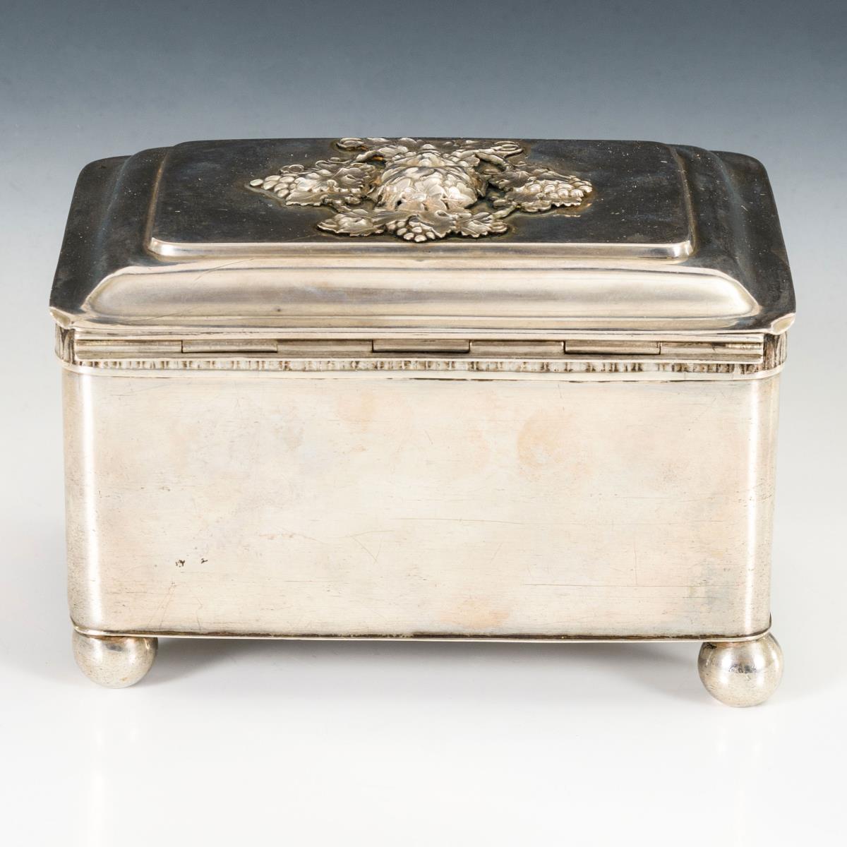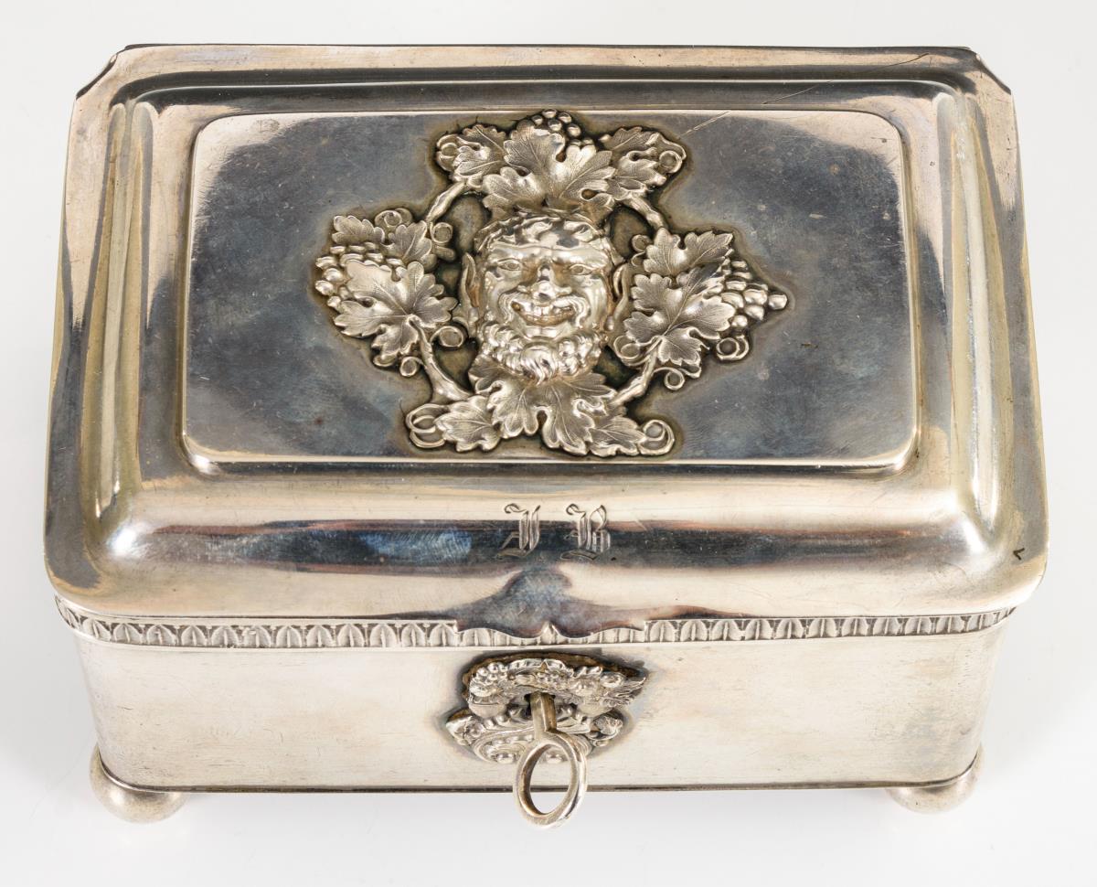 Rechteckige Biedermeier-Zuckerdose mit reliefiertem Faunskopf in Weinlaubkranz auf dem Deckel. Auf 4 Kugelfüßen. Füßchen gedellt, Schlüssel wohl ergänzt.