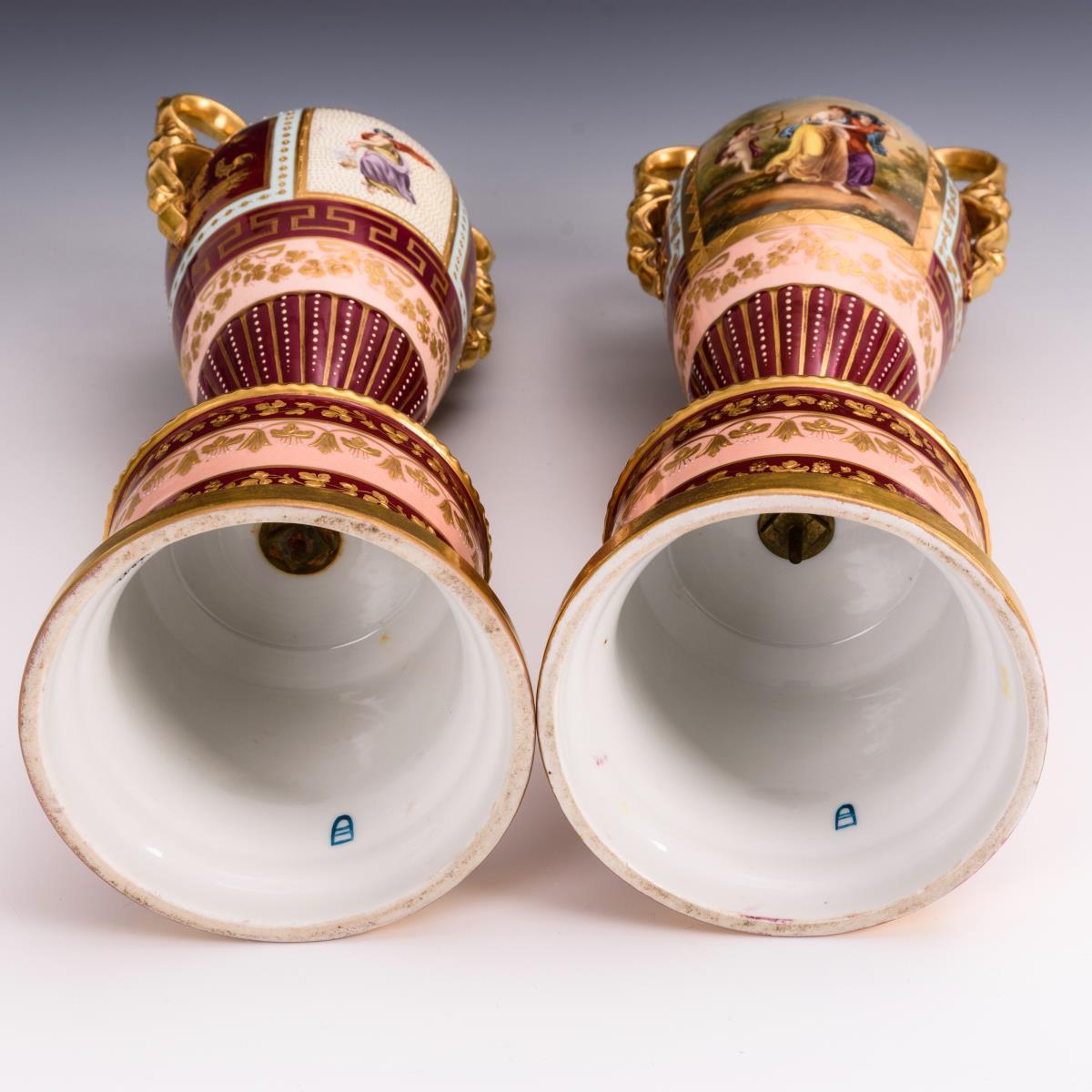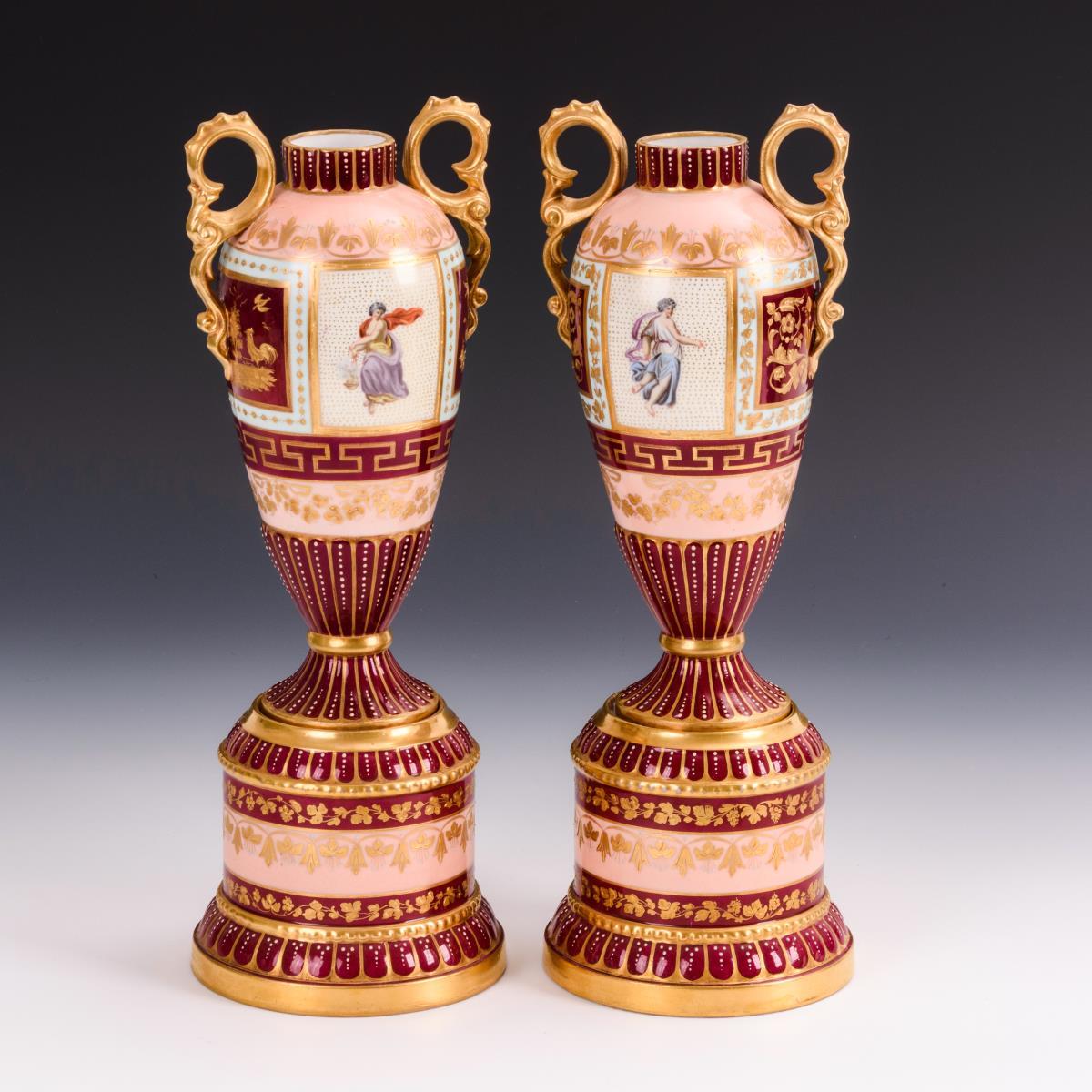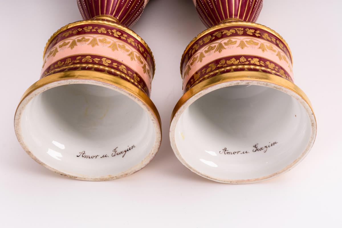 Amphorenvasen mit bordeauxfarbenem, rosafarbenem und hellblauem Teilfond, reiche, teils reliefierte Goldmalerei, schauseitig eine Rechteckkartusche mit der unterseitig bezeichneten Darstellung von Amor und den drei Grazien, Juwelenmalerei. 2 Henkel restauriert, minimaler Goldabrieb.