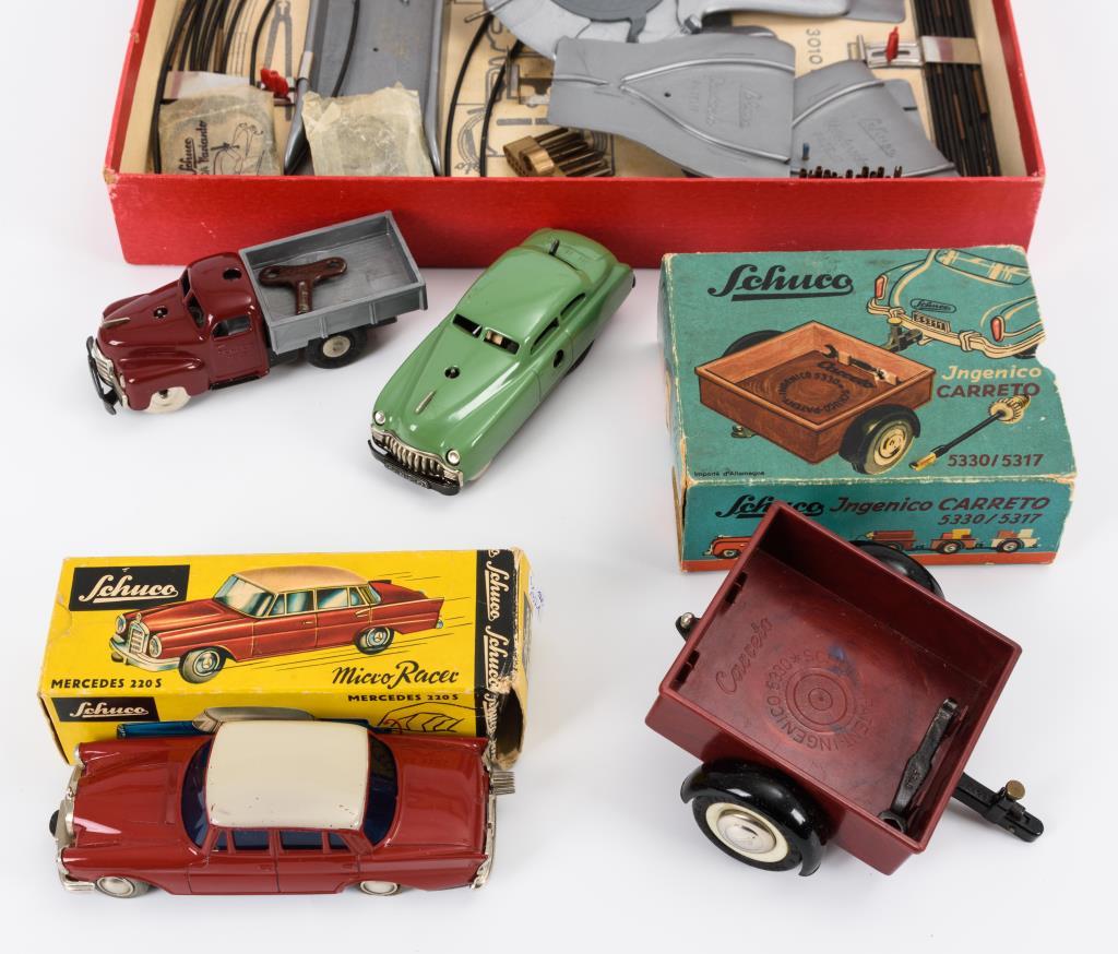 Weinroter "Micro Racer 1033": Mercedes 220S mit intaktem Werk, Schlüssel fehlt. / "Ingenico Carreto 5330"-Anhänger. / Schuco-Spiel "Varianto 3010 D" mit "Varianto-Limo 341" und "Varianto-Lasto 3042". Werke jeweils intakt.
