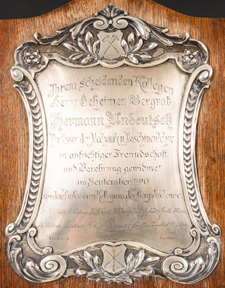 Reliefierte und gravierte Silberplatte für den "Geheimen Bergrat Hermann Undeutsch" vom "Professoren Kollegium der Bergakademie". Auf Eichenholz mit rückseitigem Klappfuß. Holz ausgeblichen, verso ergänzter Schaumstoff.