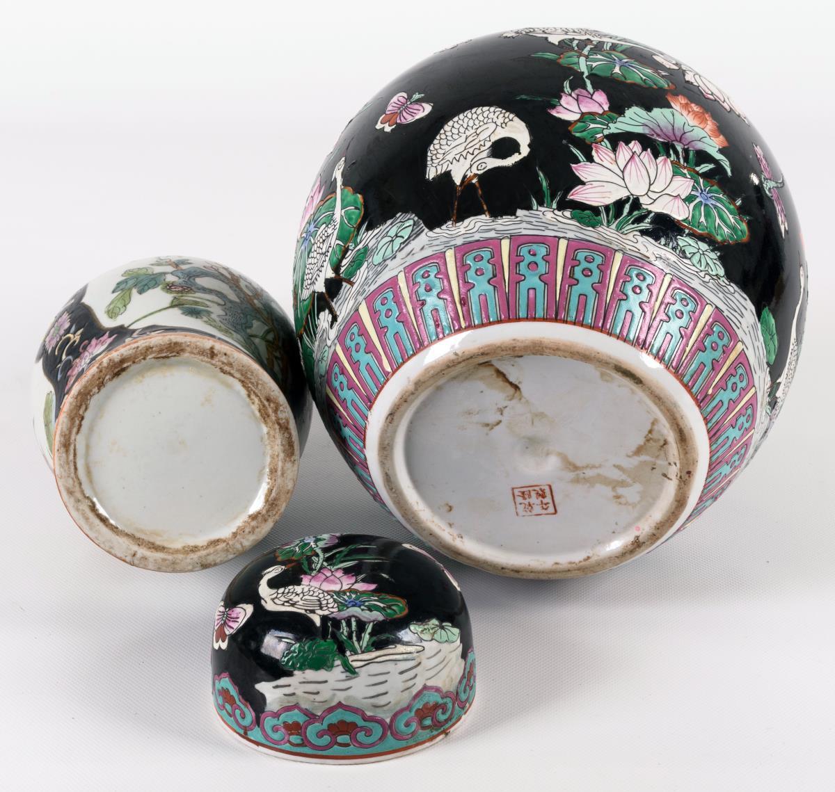 Kugelvase mit Blütenstengeln und Vögeln auf schwarzem Untergrund. Halbrunde Deckel. Gemarkt. / Schwere Vase mit konischem Hals. Zwei Bildkartuschen mit Lotos- und Päonienstück.