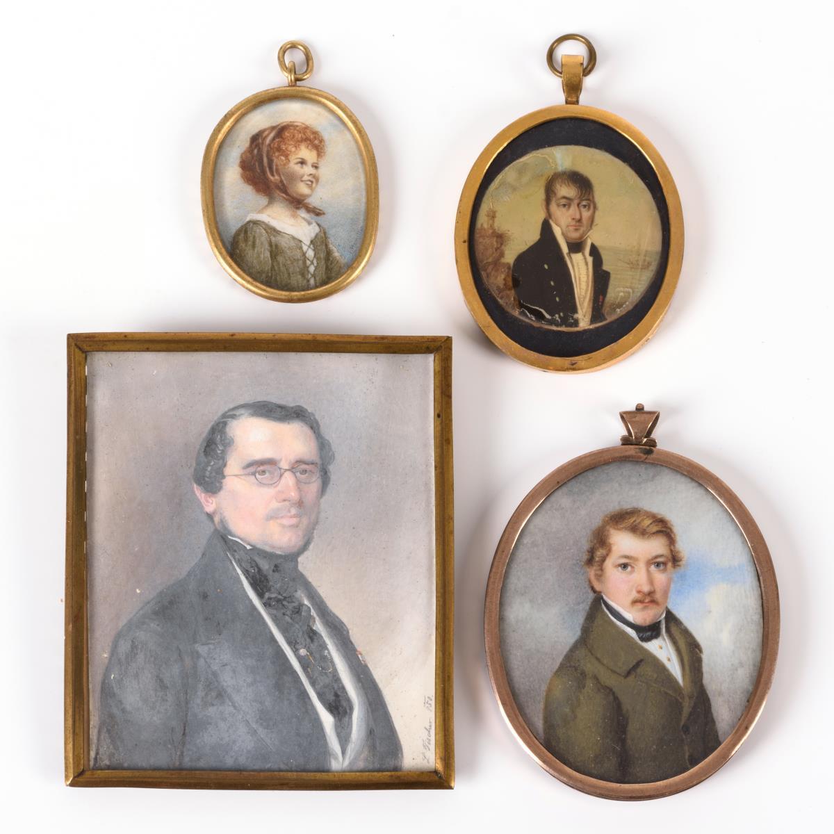Tondo eines Herren an der Küste mit Leuchtturm und Dreimaster. / Ovales Herren- bzw. Damenbildnis. / Signiertes Gouache eines Herren mit Brille. Zumeist wenige, 1x starke Alters-/Gebrauchsspuren mit Haarriss.