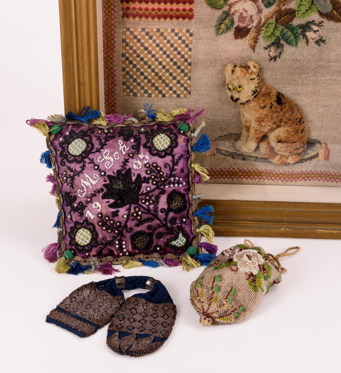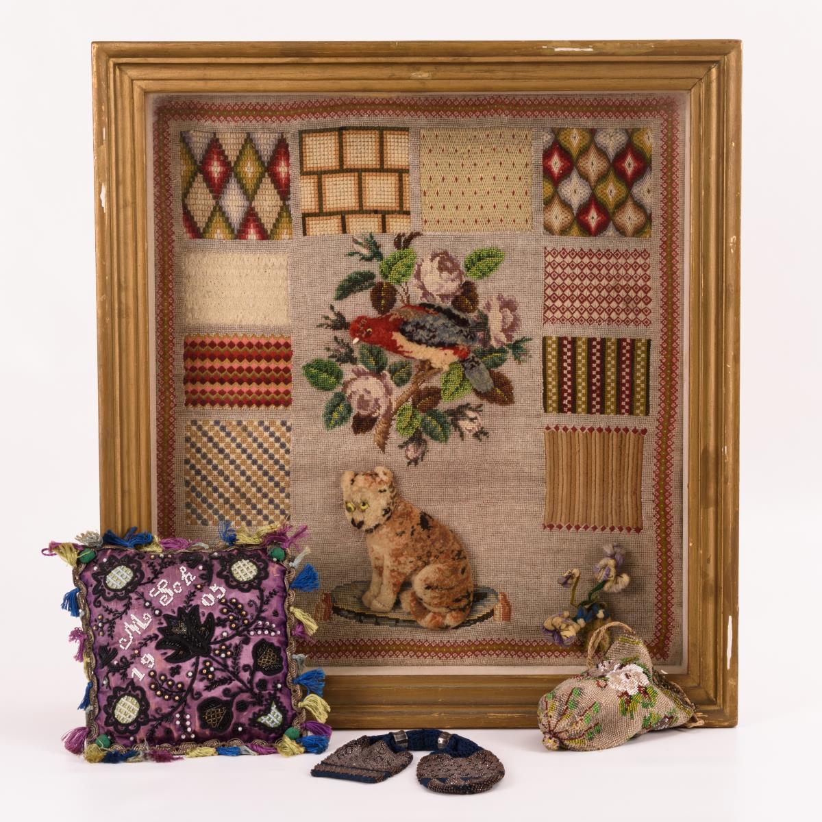 Großes Stickmustertuch mit aufwendigen Stickproben, plastisch geknüpften Tieren und mit Glasperlen teilbestickt. Verglast und gerahmt. Kleines Zierkissen mit Motivstickerei, monogrammiert und datiert M. Sch. 1905. Gestrickter Perlbeutel mit Kordeldurchzug. Gehäkelte Geldkatze, mit Metallperlen teilbestickt, 2 Verschluss-Metallringe .