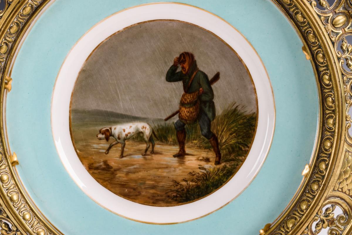 Teller mit türkisfarbener Fahne, im Spiegel die Darstellung eines Jägers mit Hund im strömenden Regen.