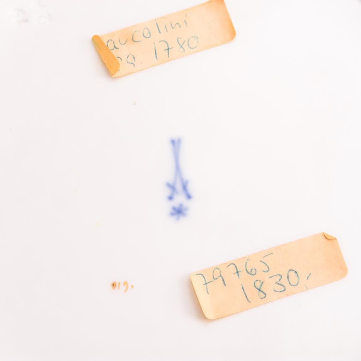 Form "Dulong". Im Spiegel ein Blumenbukett, auf der Fahne vier Kartuschen mit Vögeln. 2x mit Randrestaurierung, partieller Goldabrieb am Rand.