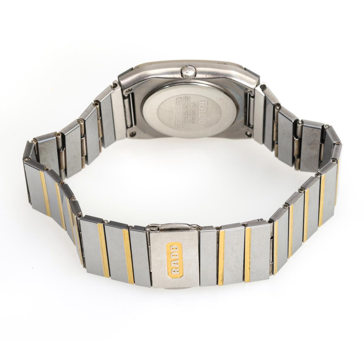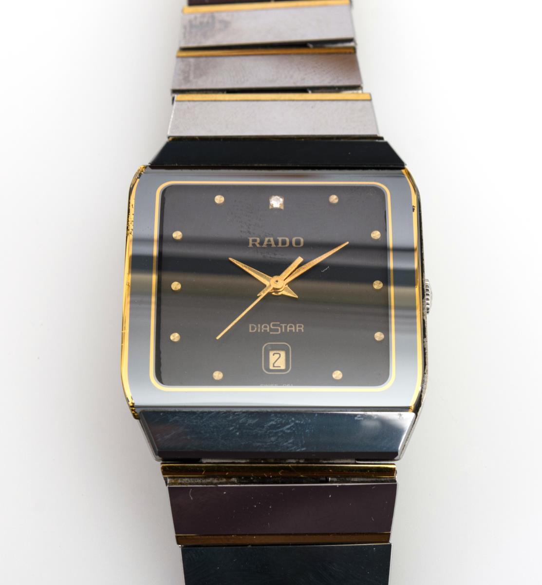 Quarzwerk mit Stellkrone. Schwarzes Zifferblatt mit Stunden-Indizes, Datumsanzeige, Blattzeiger mit Zentralsekunde. Herstellerprägung Anzeige: Rado DiaStar.