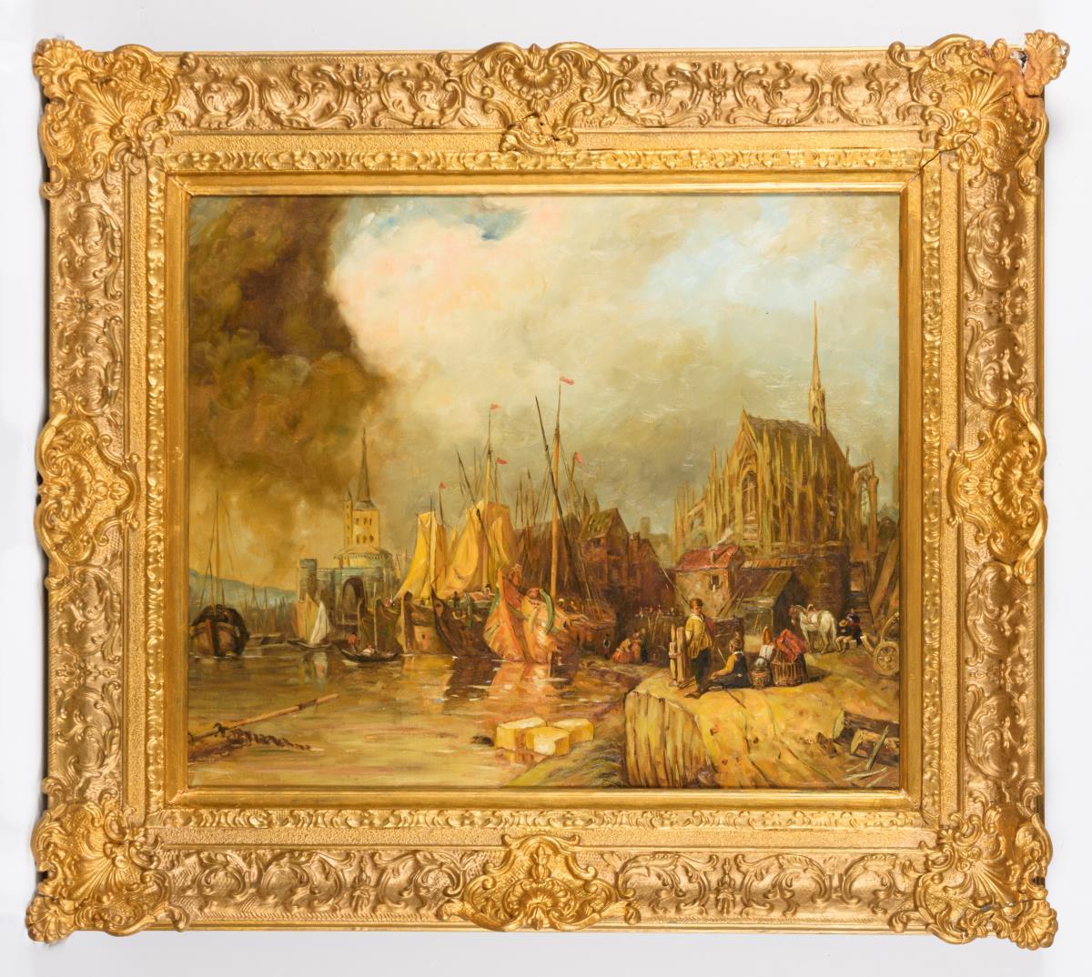 Viele Schiffe im Hafen nahe der Kathedrale im Sonnenschein.