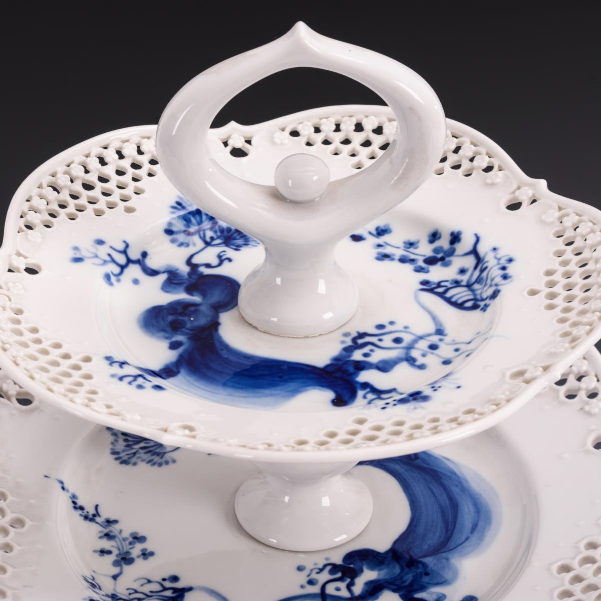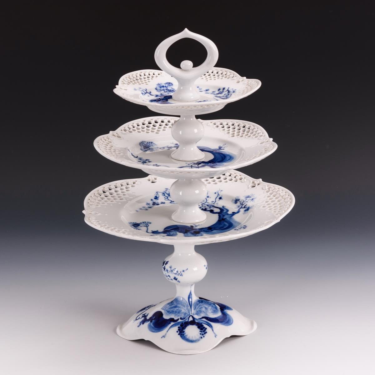Form "Großer Ausschnitt". Etagere mit drei übereinander geordneten Durchbruchtellern und Vierpassfuß.