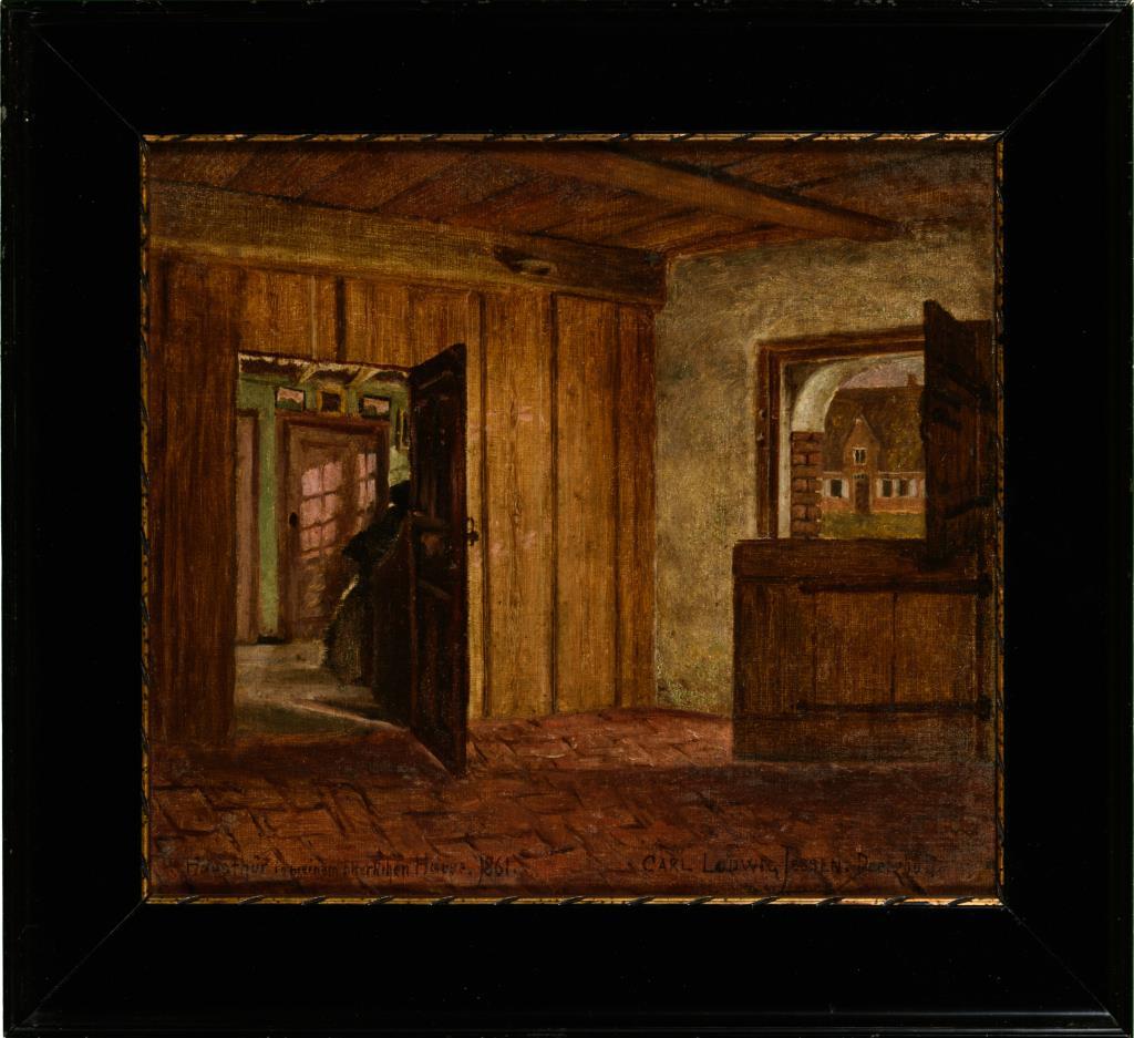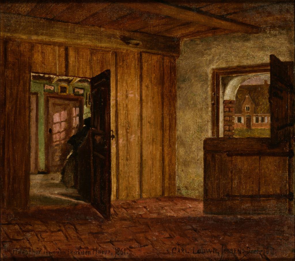 Öl/Leinwand/Holz.Rechts unten signiert mit Zusatz Deezbüll.Datiert: 1861 mit Zusatz "Haustür in meinem elterlichen Hause.