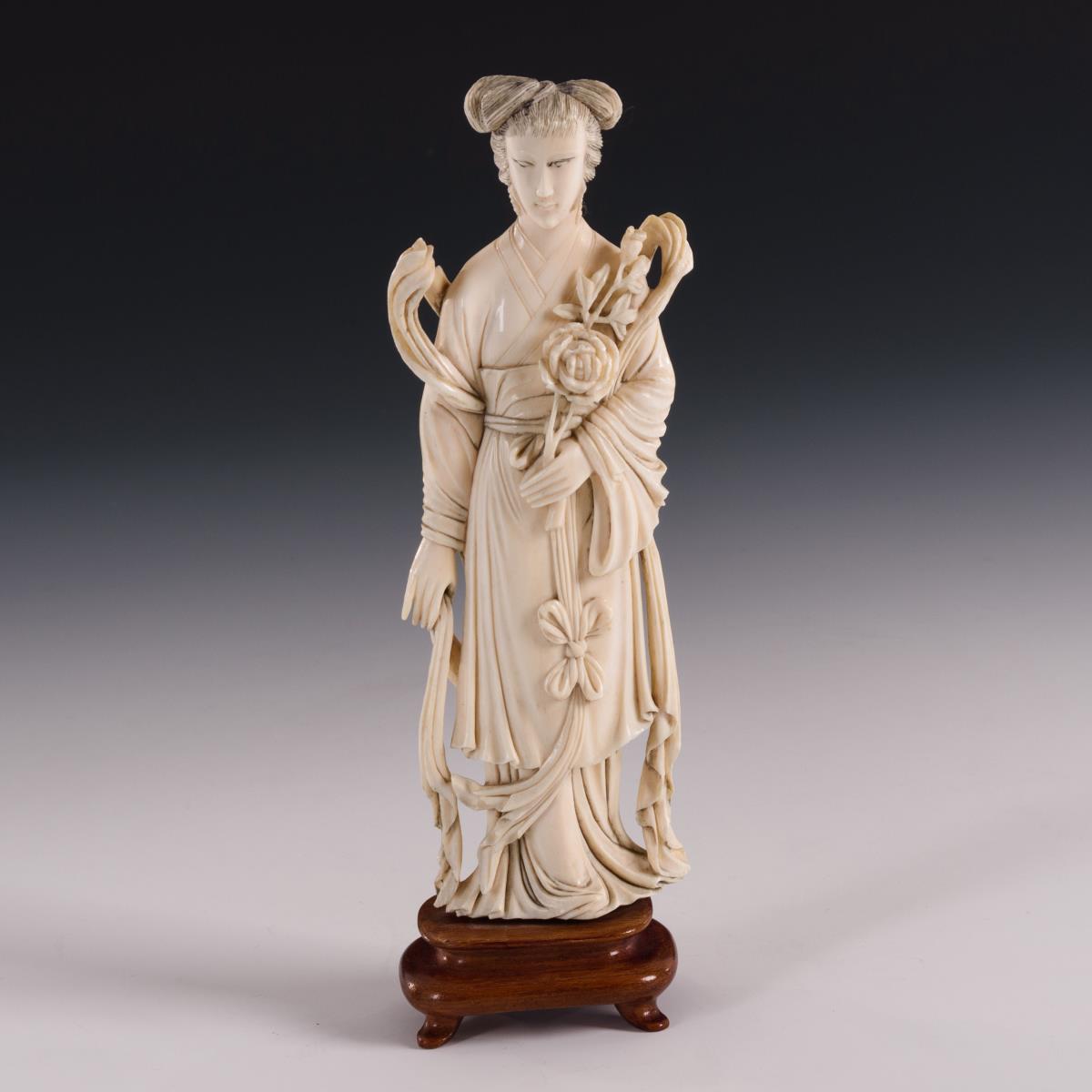 Mädchenhafte Figur mit wehenden Kleidern und Bändern, das lange Haar teils zu einem Knoten gebunden. In der Hand eine Päonienblüte. Auf hölzernem Sockel.