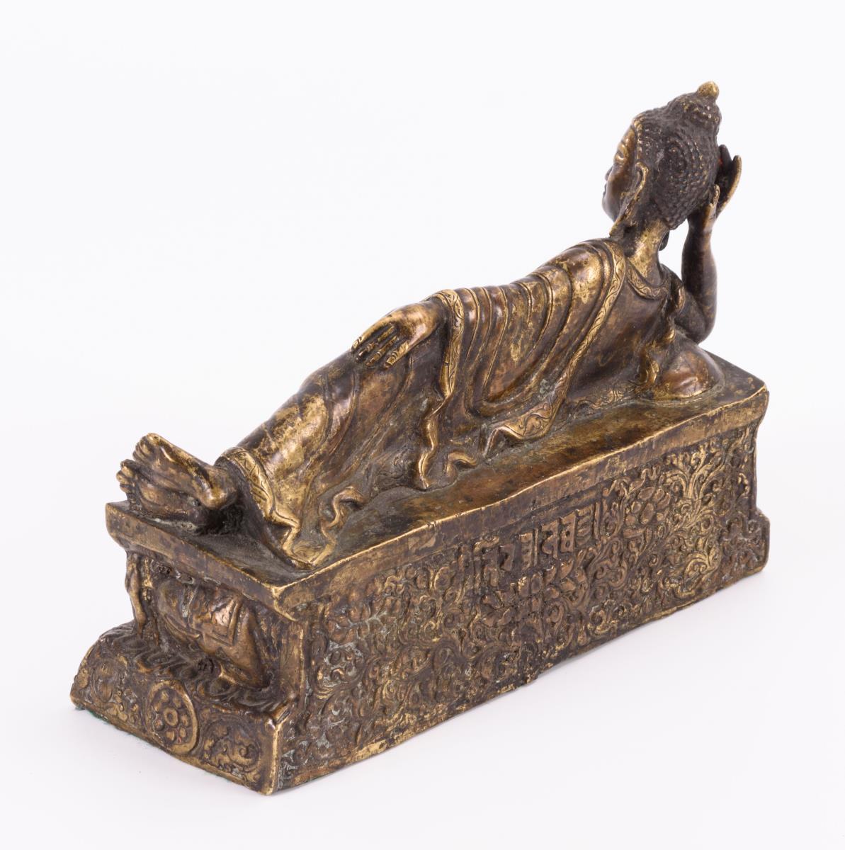 Reliefierter Sockel mit stilisierten Buddhas und Elefanten, auf der Rückseite florales Ornament mit Schriftzug in Sanskrit(?). Seitlich liegender Buddha mit aufgestütztem Kopf. Altersspuren.