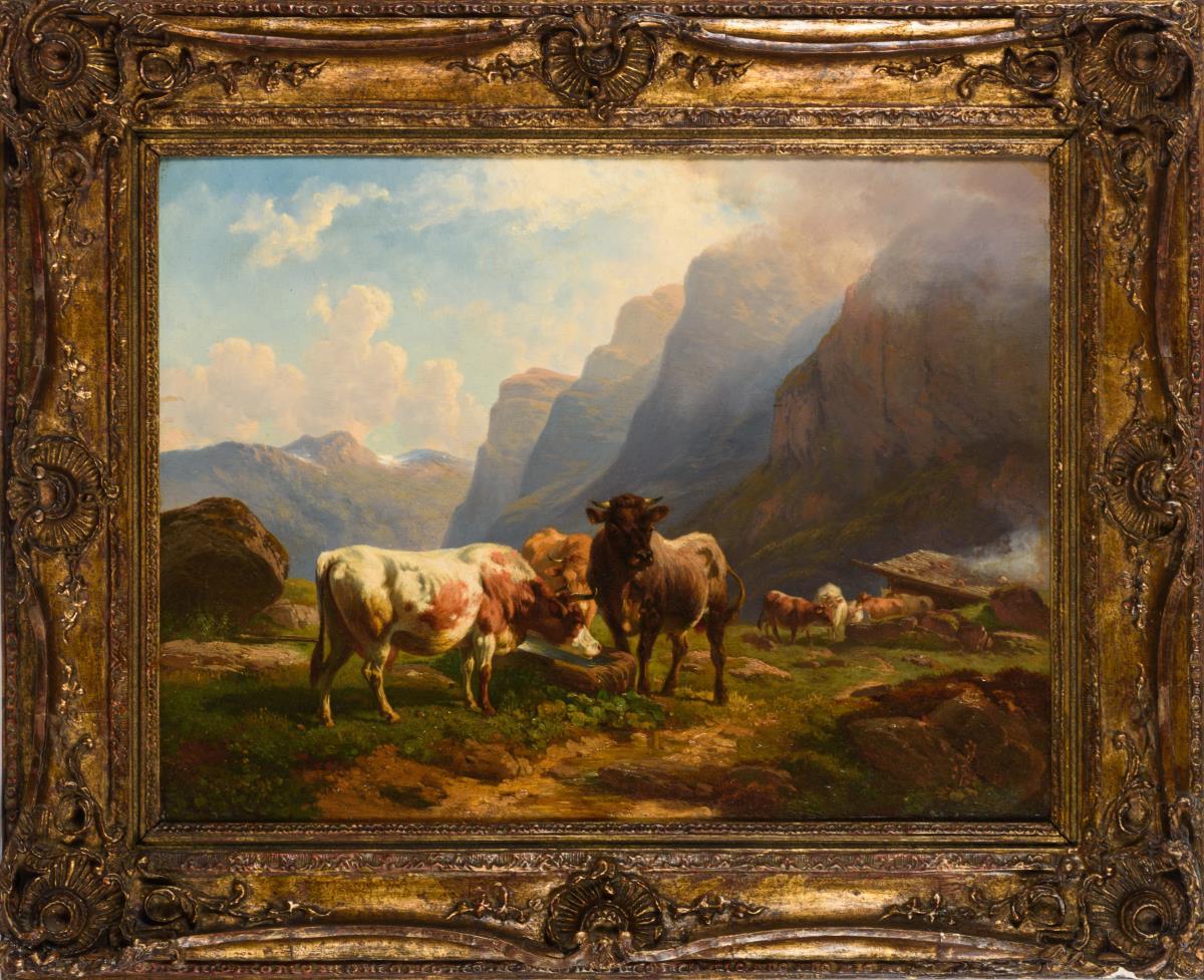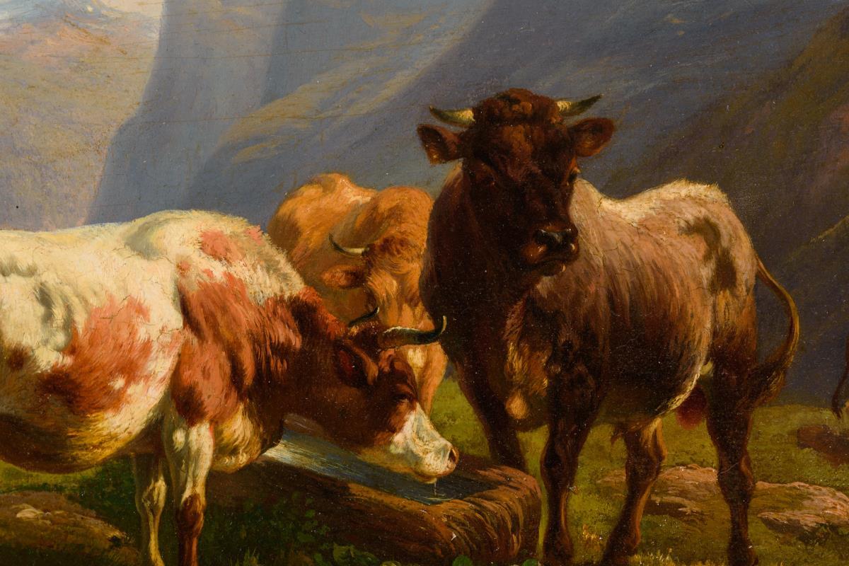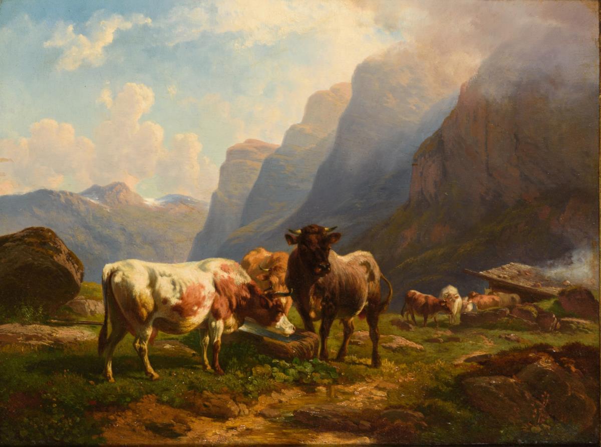 Rinder an der Tränke in weiter Gebirgslandschaft im Sonnenlicht. Leichte Altersspuren.