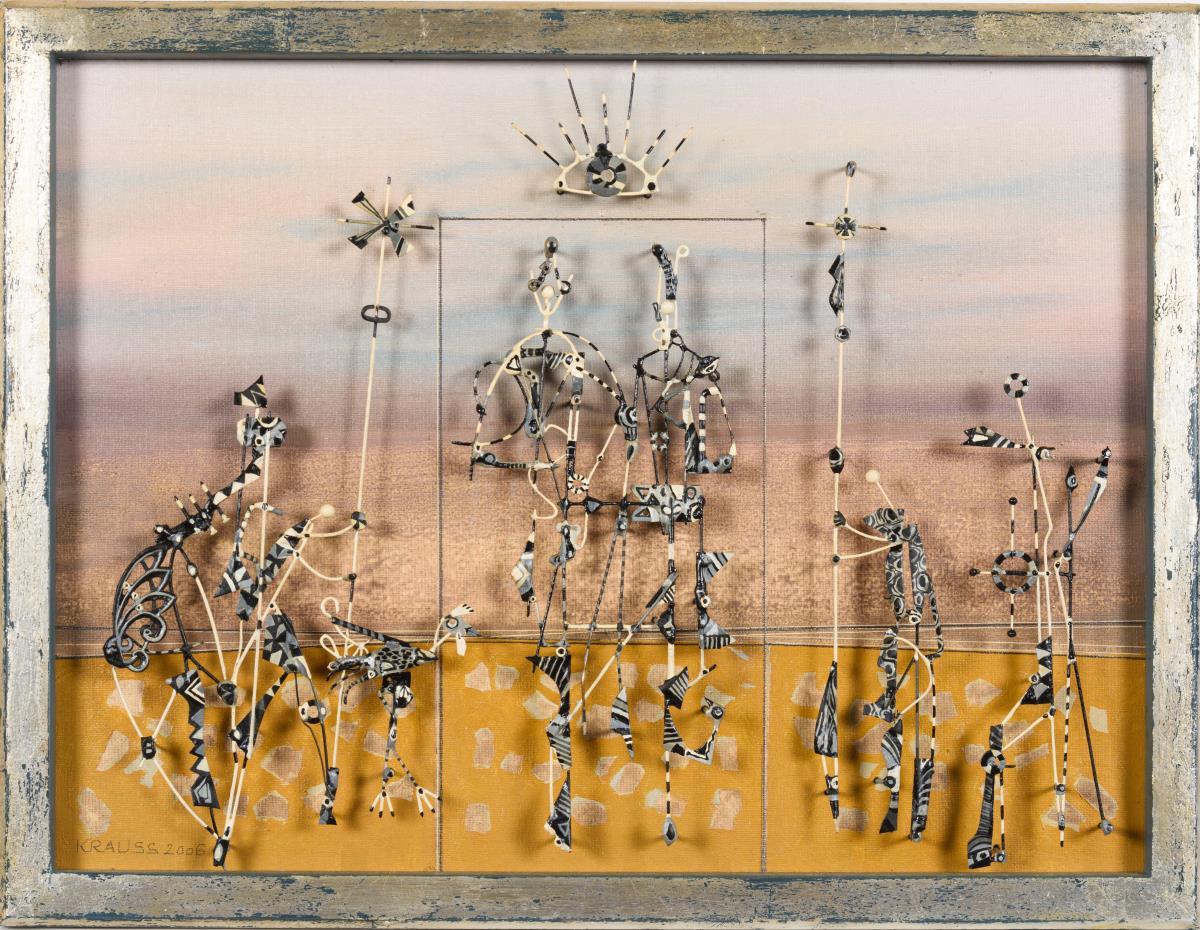 Mischtechnik mit figürlichen Metallapplikationen. Unsigniert.