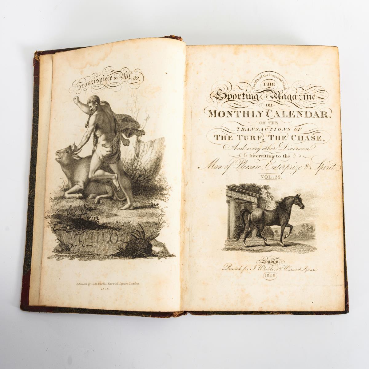 Beginnend mit April 1808 (Vol. 32). 292, 4, 88 Seiten mit ca. 13 sehr schönen Kupferstichen mit Tierdarstellungen (Pferde, Hunde u.a.). Halbledereinband mit Altersspuren.