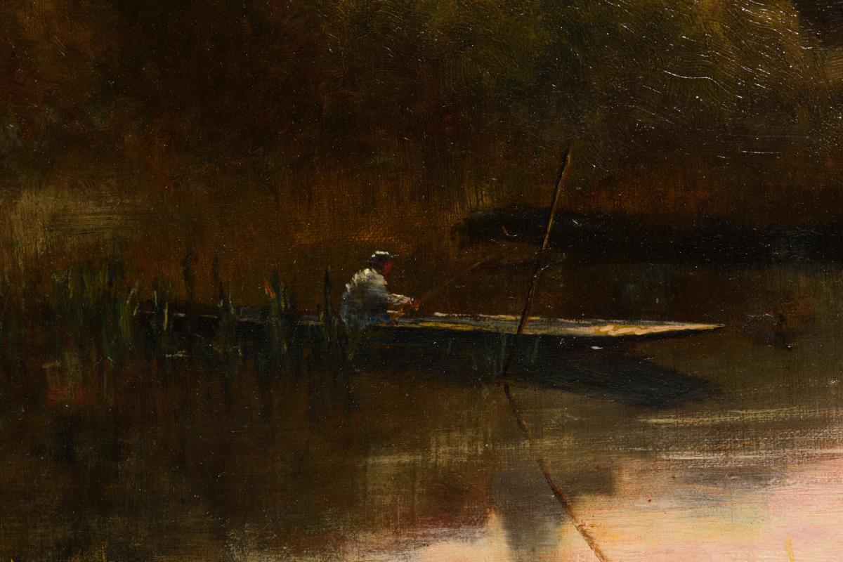 Angler im Kahn nach Sonnenuntergang unweit des Dorfes.