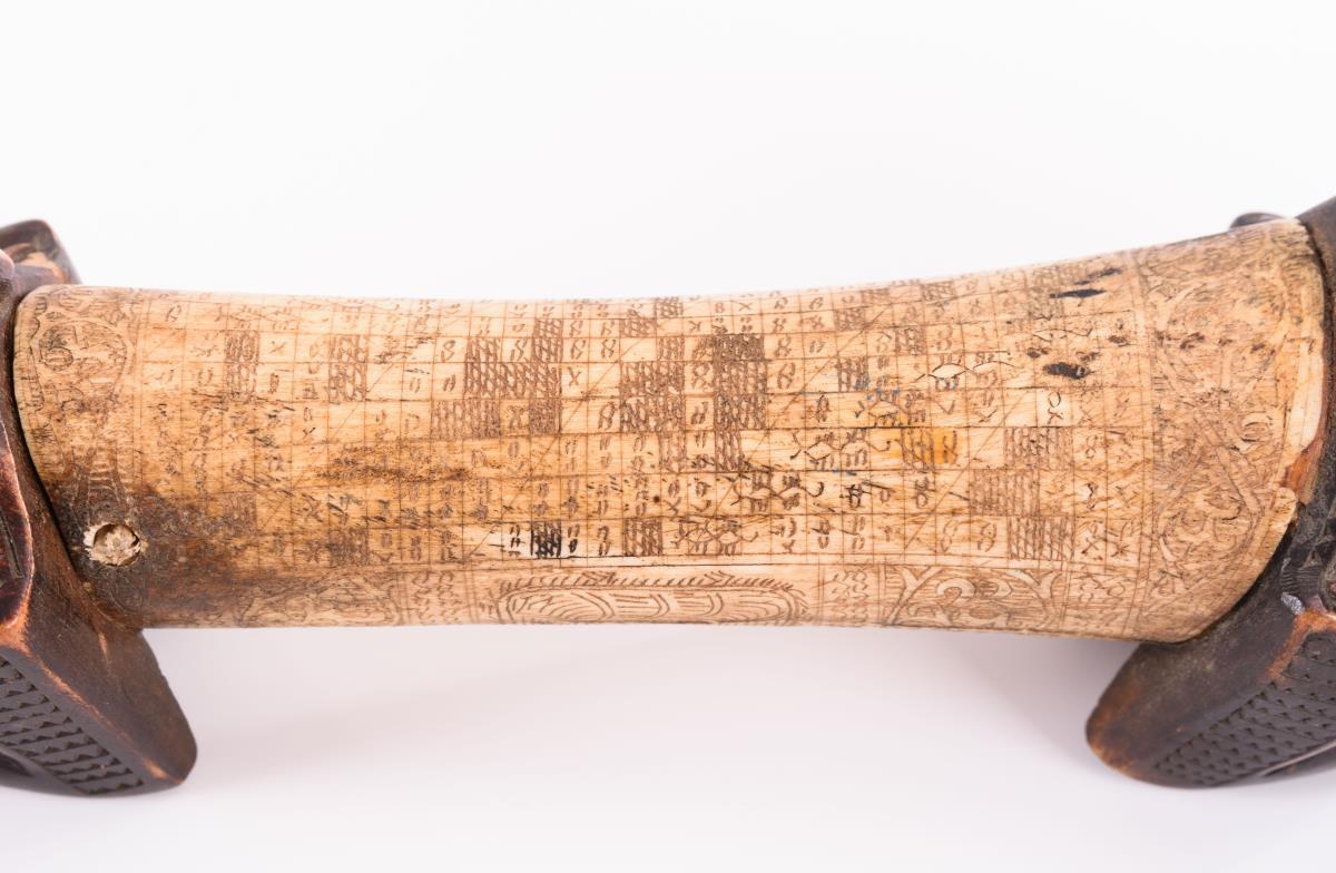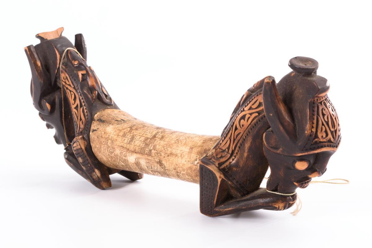 Hohler Knochen mit äußerst fein geritztem Kalendarium (?) und ausdrucksvoll geschnitzten Köpfen. Einer fest und einer mit dünne Stiften als Stöpsel verwendet. Ein Kopf mit kleineren Fehlstellen am Knauf, Stifte ergänzt.