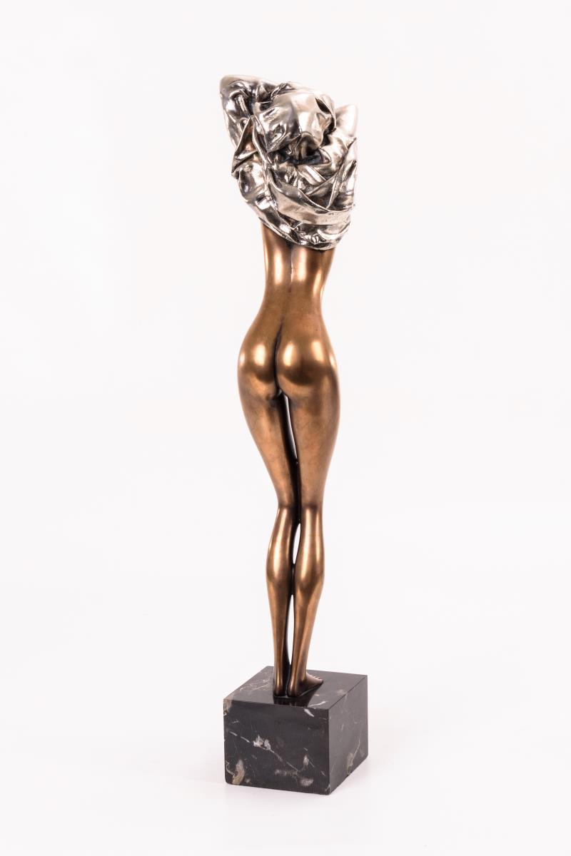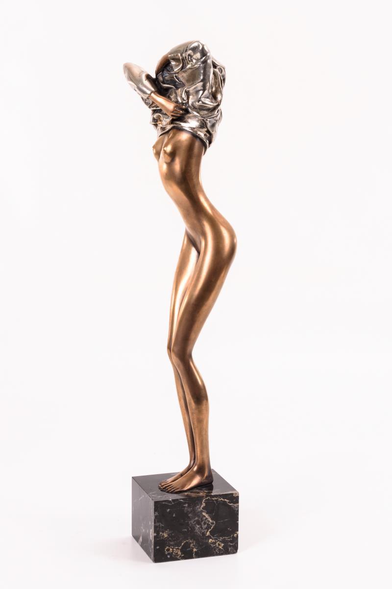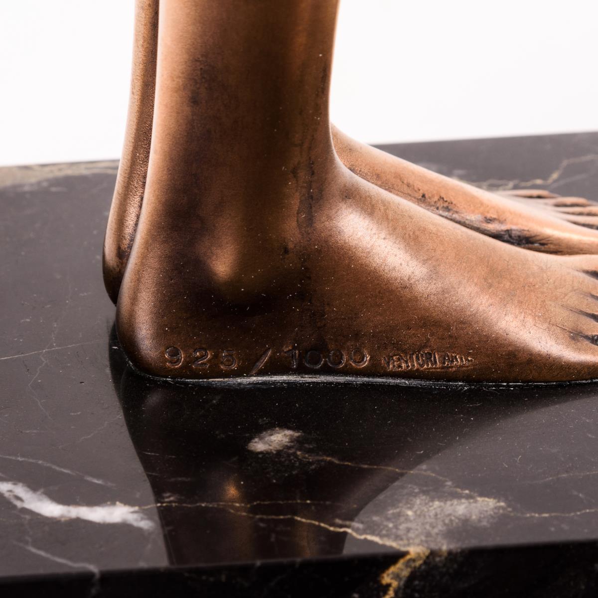 Bronze goldbraun patiniert, teils versilbert, schwarzer Marmor-Sockel. Bezeichnet, Gießermarke "Venturi Arte" mit Zählung "925/1000". H 55,5 / 63,5 cm.