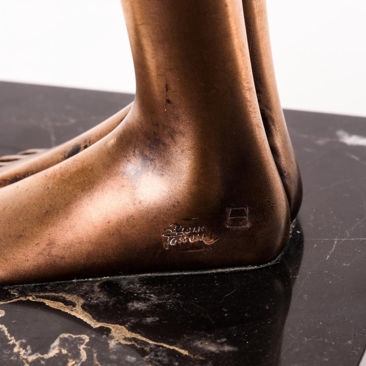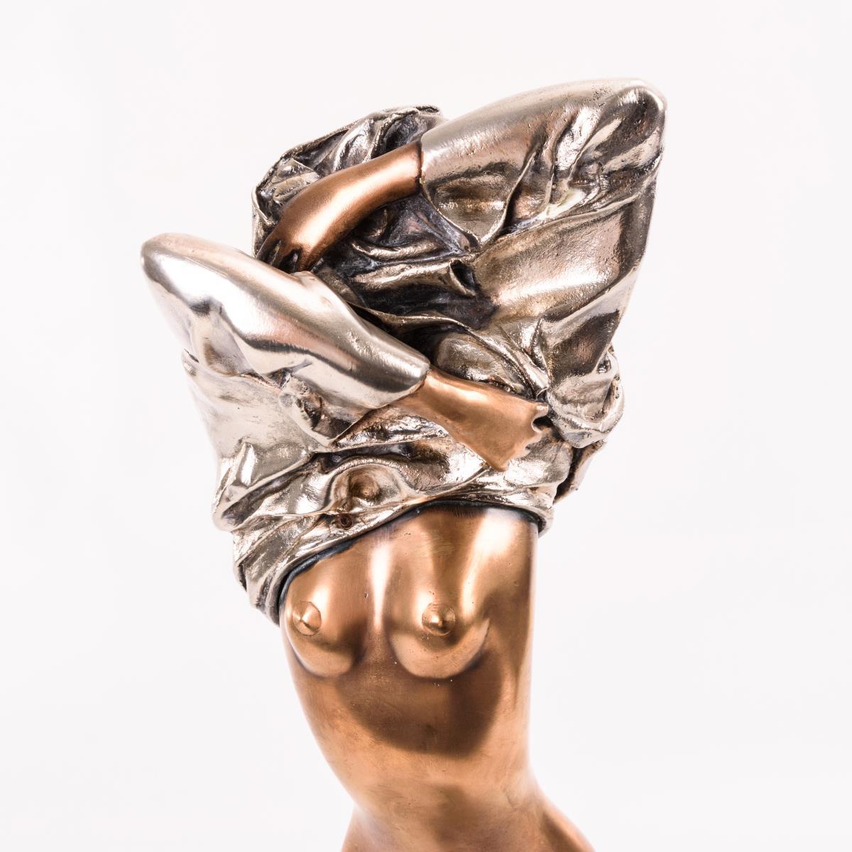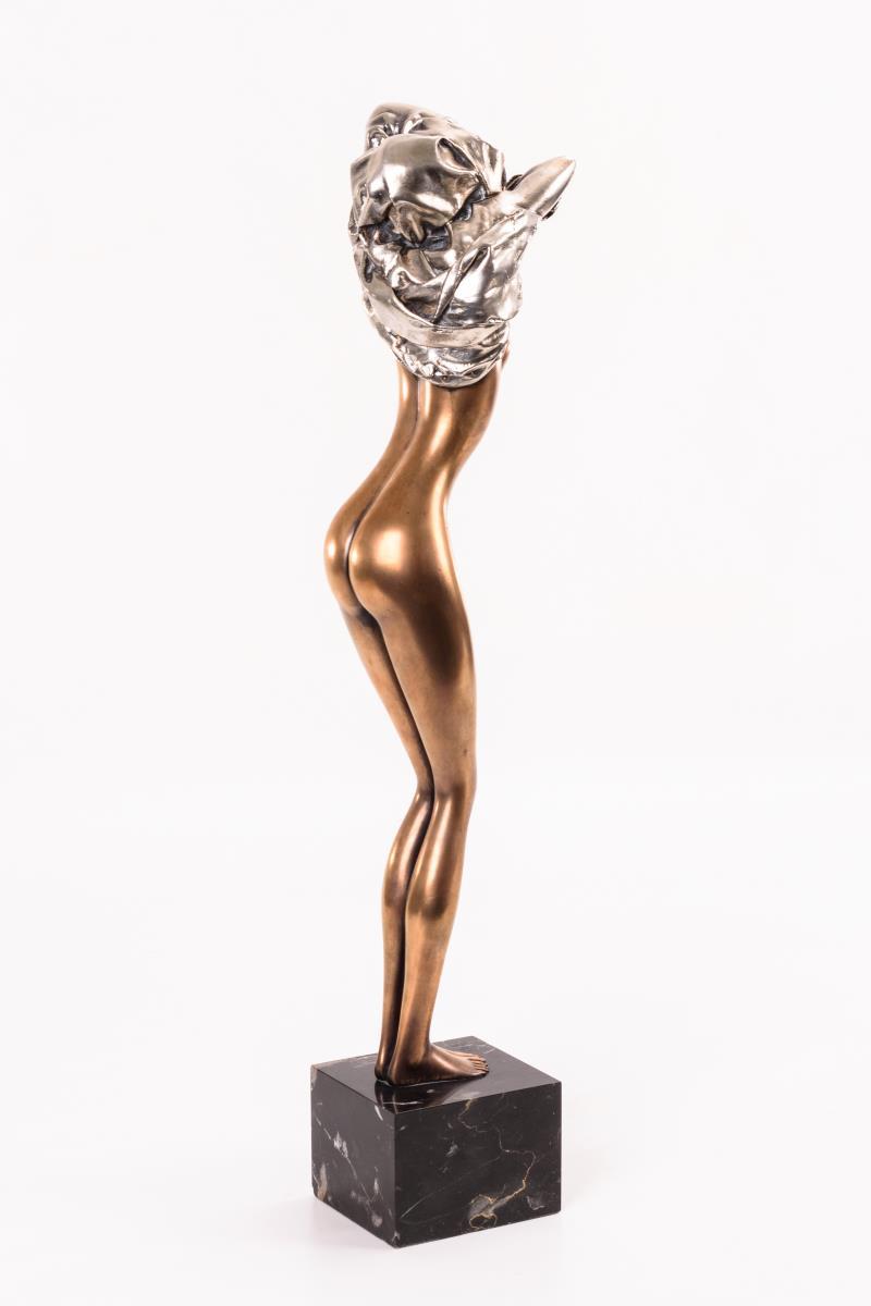 Bronze goldbraun patiniert, teils versilbert, schwarzer Marmor-Sockel. Bezeichnet, Gießermarke "Venturi Arte" mit Zählung "925/1000". H 55,5 / 63,5 cm.