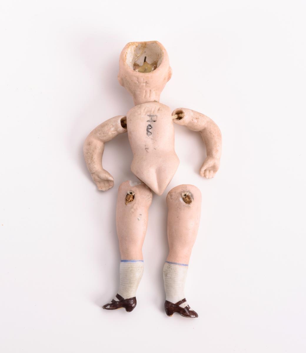 Kurbelkopf, blaue Schlafaugen, blonde Mohairperücke. Körper mit losen Gliedern, Schuhe und Strümpfe gemalt. Mit Häkelkleidung, Häubchen, Täschchen und länglichem Kissen. 1 Bein mit kleinen Chips.