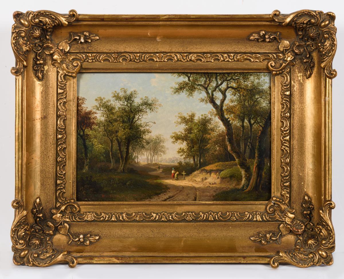 Romantische Waldlandschaft mit Staffage an einem Kreuz im Sonnenschein. Pendant zu Kat.-Nr. (2766).