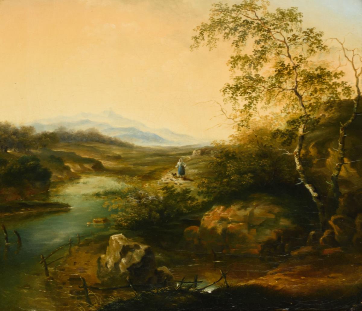 Felsige Berglandschaft mit Weiher und Staffagefiguren. Leichte Altersspuren.