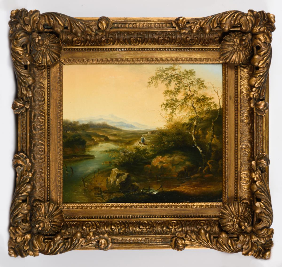 Romantische Flußlandschaft in prunkvollem Stuckrahmen