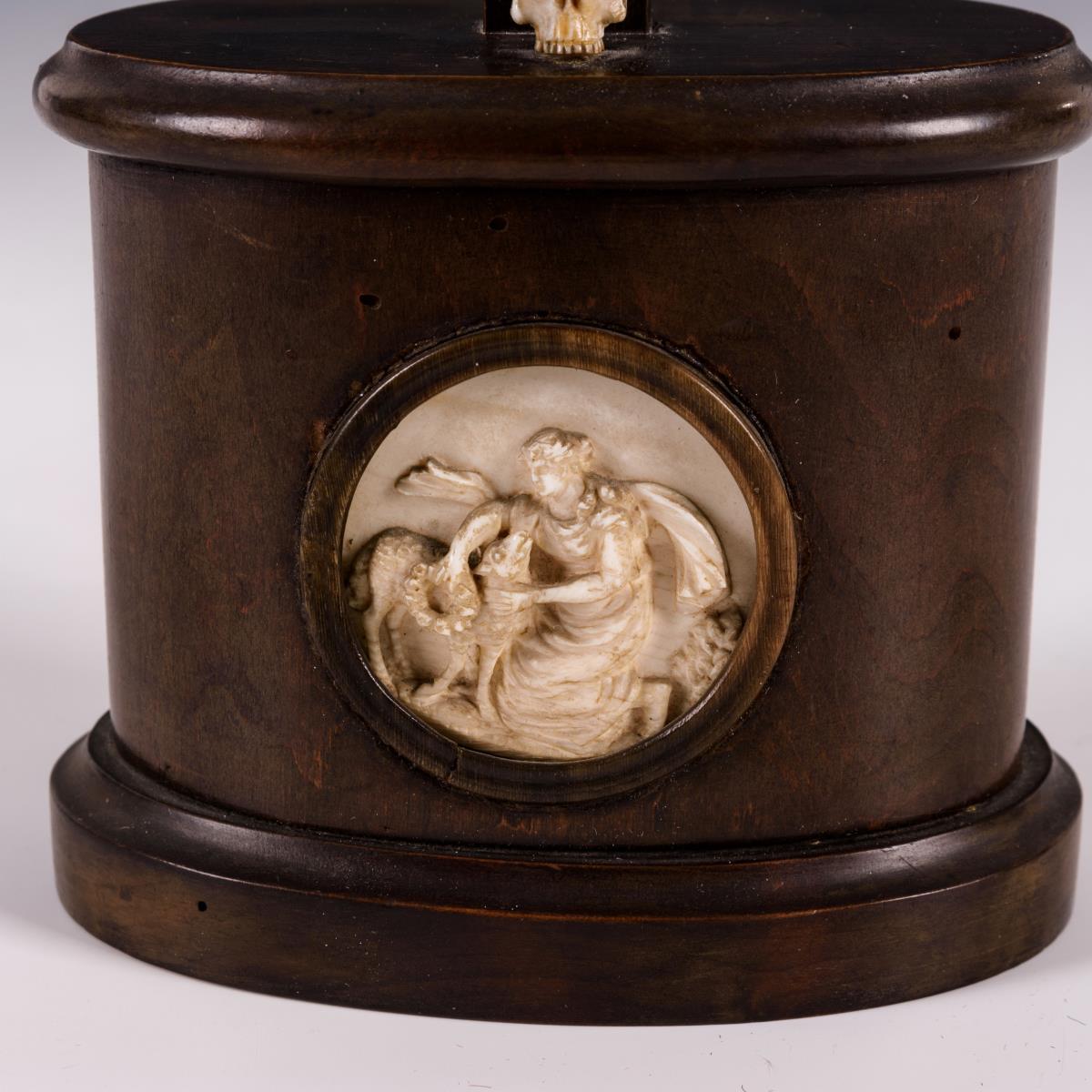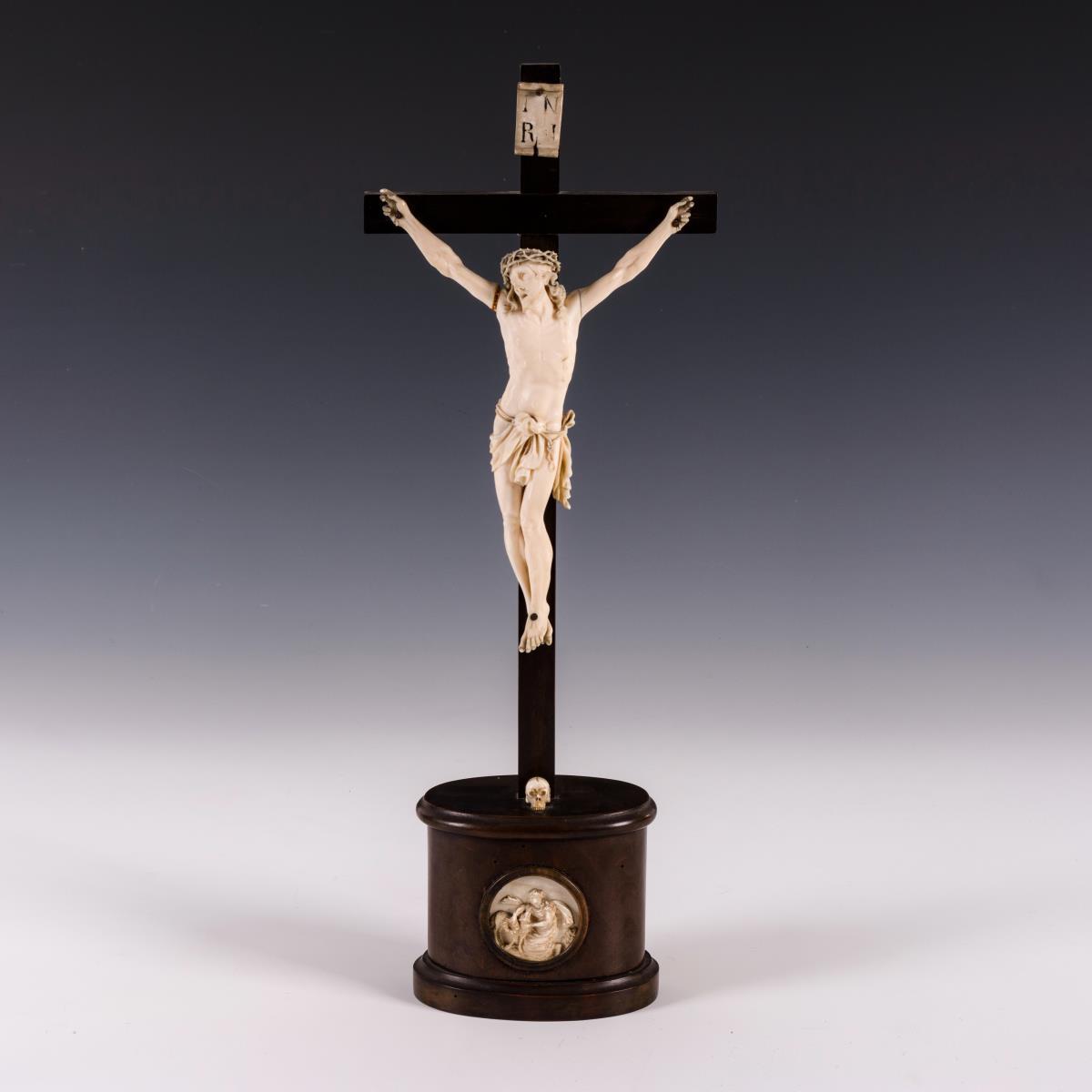 Qualitätvoll gearbeiteter Corpus Christi in barocker Art am Kreuz. Ovaler Holzsockel mit Totenkopf und Elfenbein-Relief: Frau mit Lamm und Blumenkranz. 1 Armnaht gelockert, Relief und Totenschädel haarrissig, Holz minimale Anobienspuren.