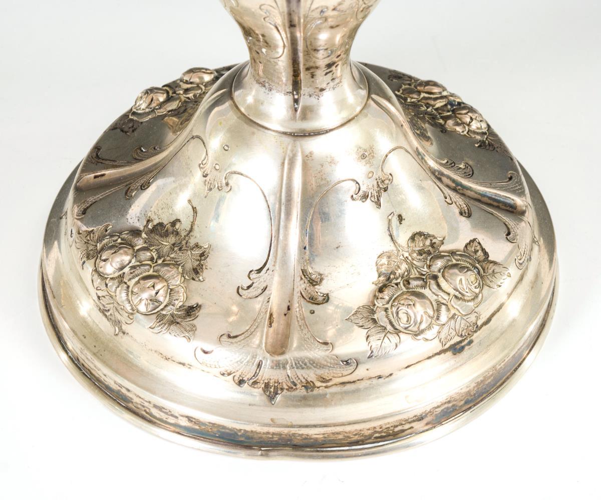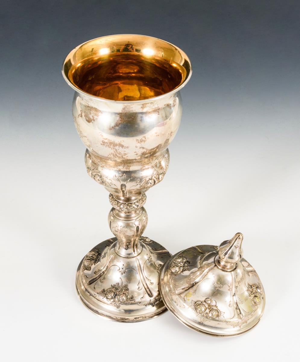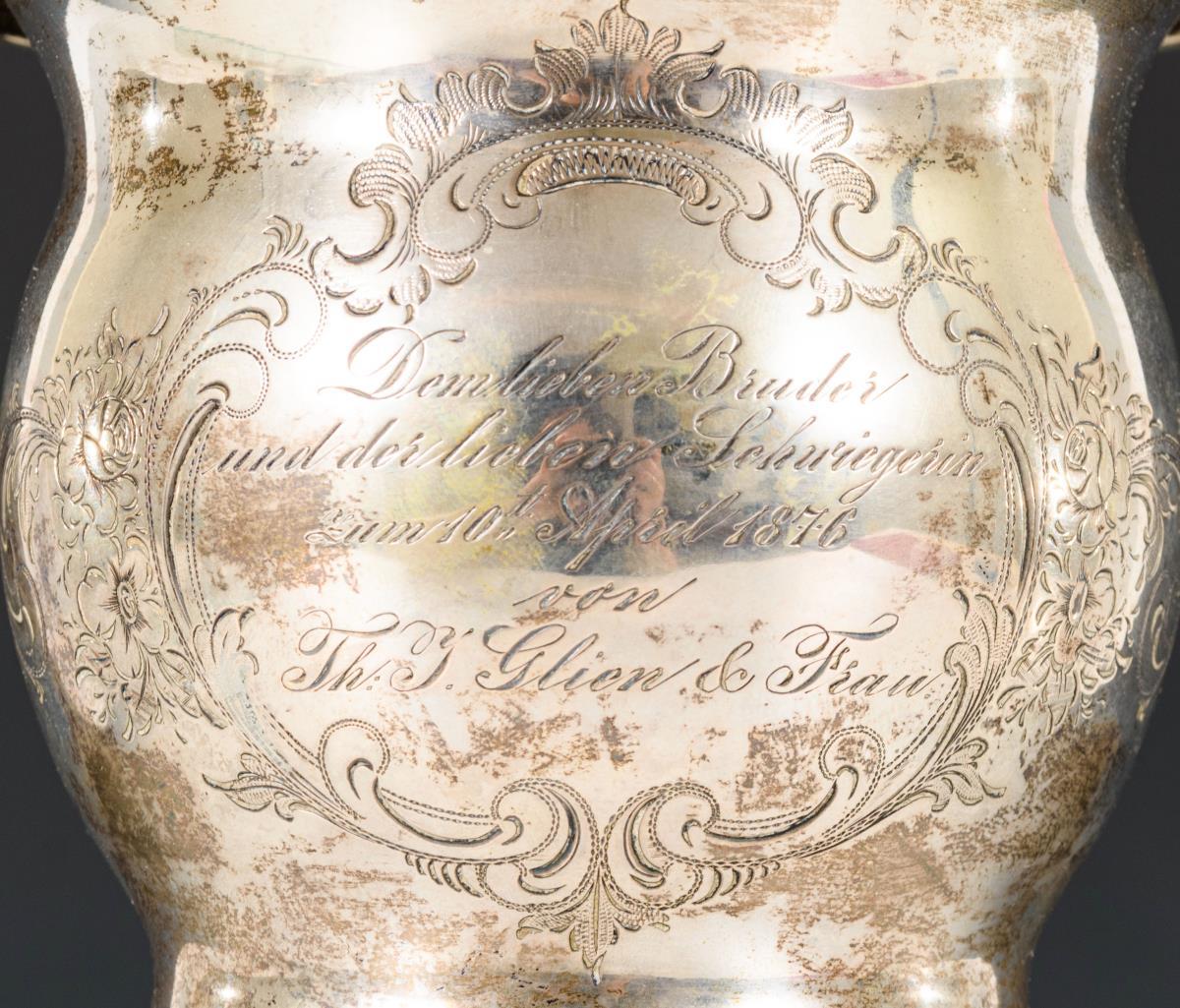 Floral reliefierter Korpus mit feinen Rocaillengravuren und Widmung: "Dem lieben Bruder und der lieben Schwägerin am 10. April 1876 von Th. J. Glien & Frau". Innen vergoldet. Am Fuß minimal gedellt.
