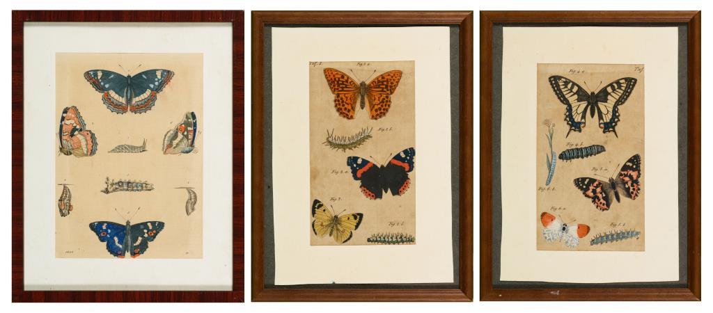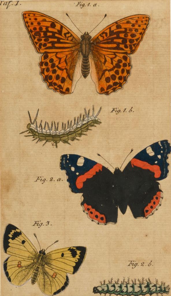 3 Abbildungen mit Schmetterlingen und Raupen, aus: Friedrich Justin Bertuchs Bilderbuch für Kinder, um 1800. Beschnitten, etwas stockfleckig.