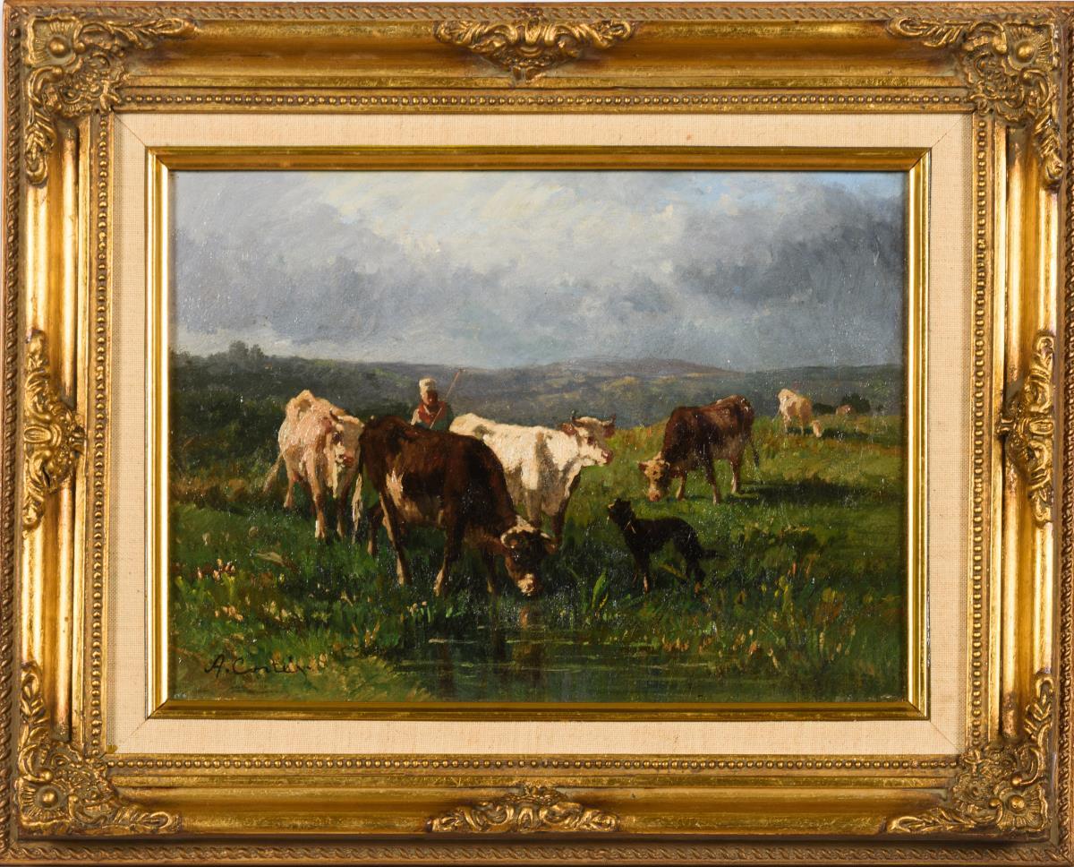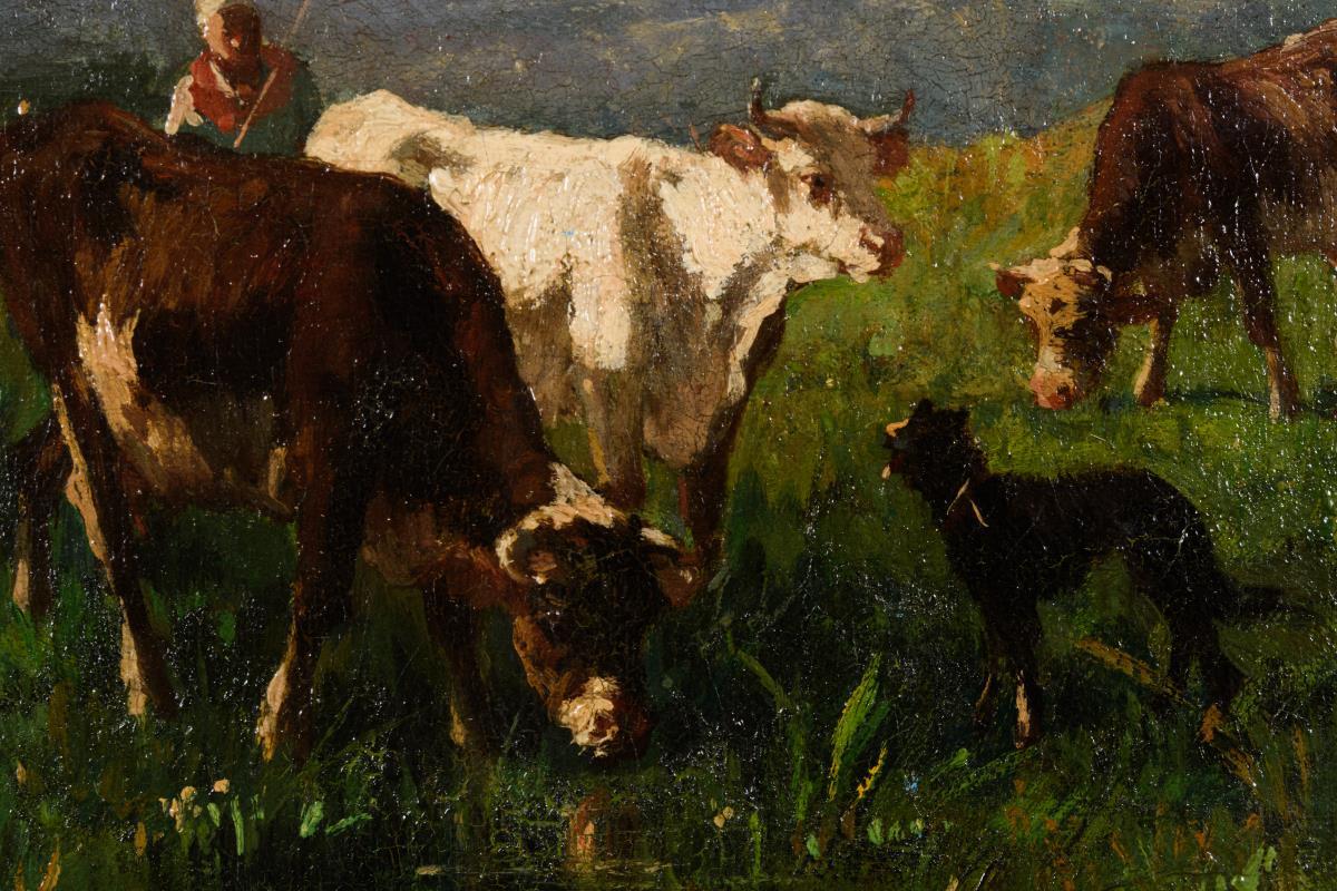Die Tiere mit dem Hirten am Ufer des Gewässers. Zwei kleine restaurierte Stellen mit Hinterklebungen.