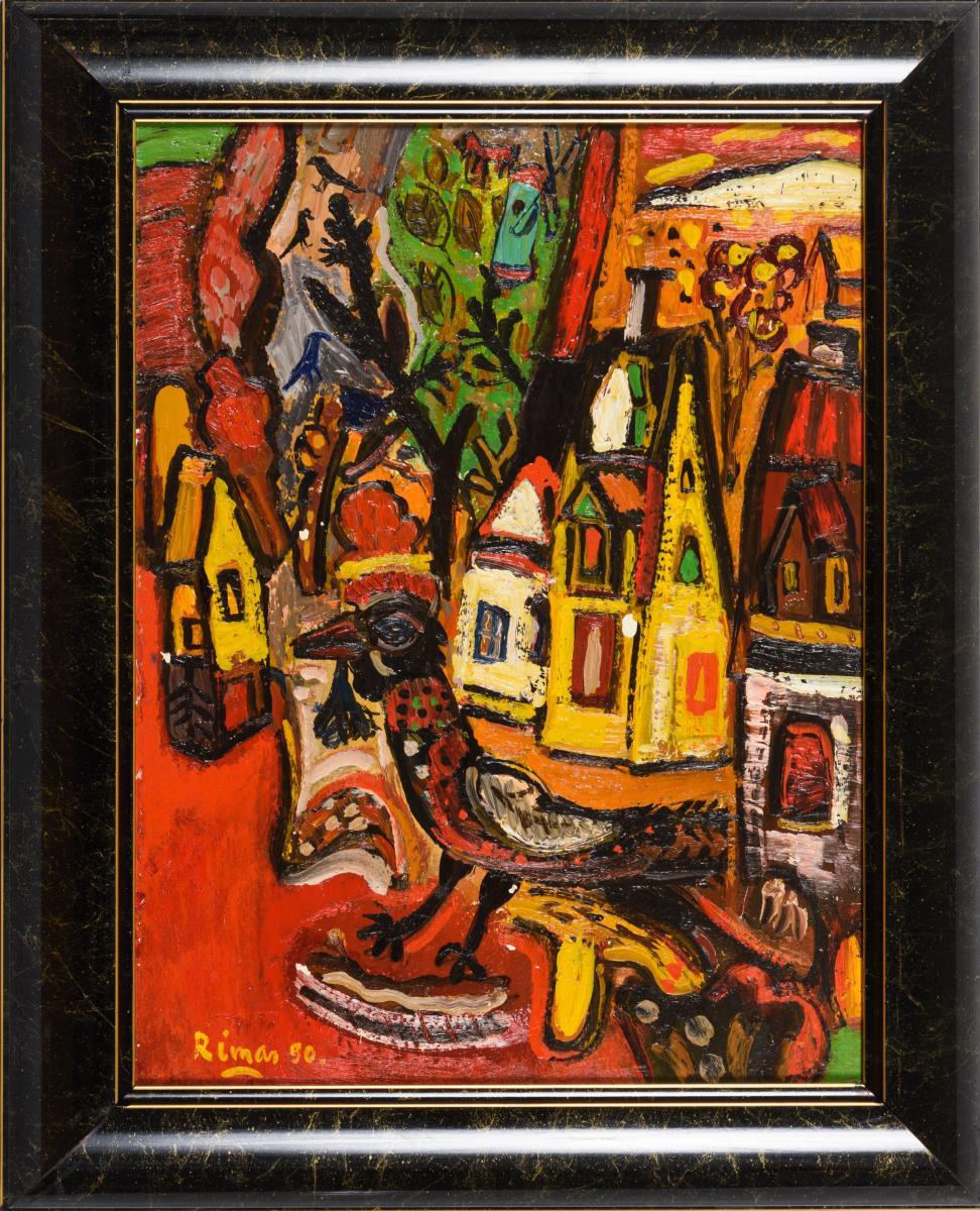 Farbenfroh dargestellte Stadt mit Hahn, Wiesen und Feldern sowie einer Windmühle.