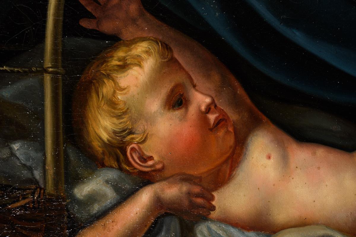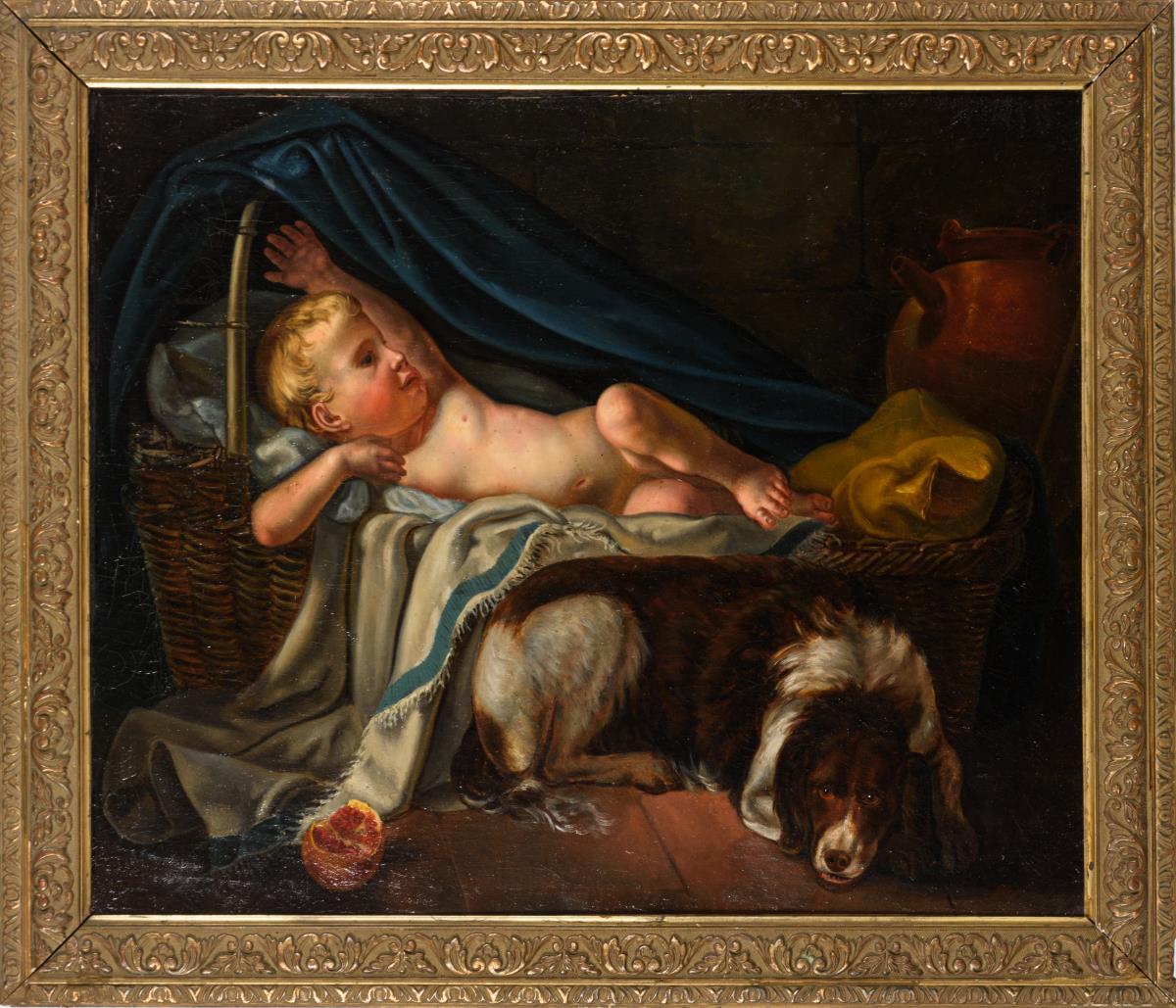 Kleiner Junge im Schlafkorb mit dem wachenden Hund davor. Leinwand doubliert.