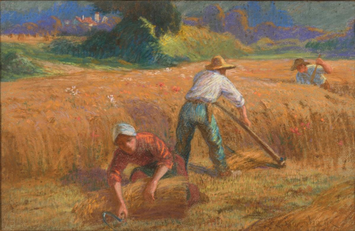 Die Bauern im Sonnenschein beim Ernten des Weizens. Minimale Altersspuren.