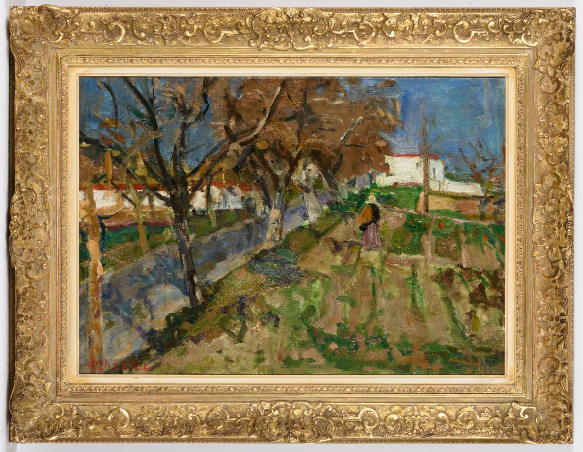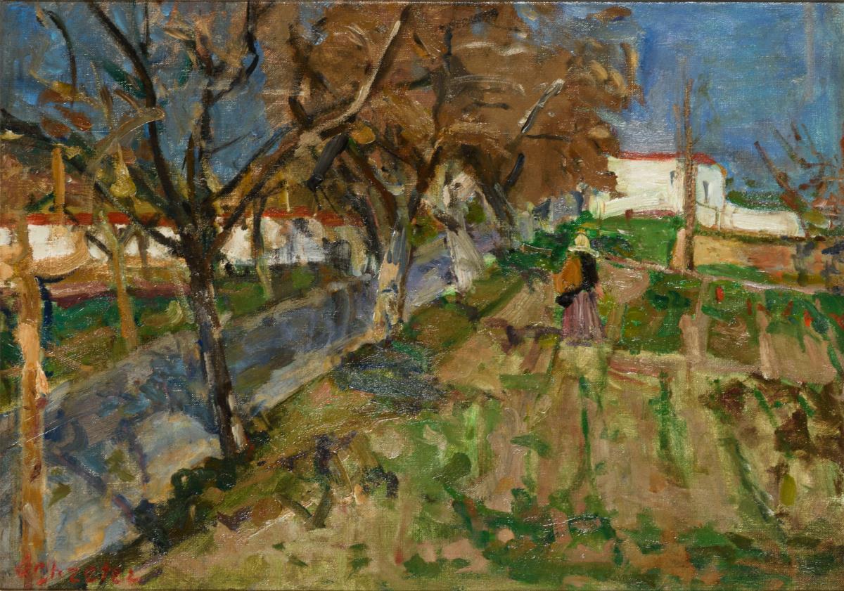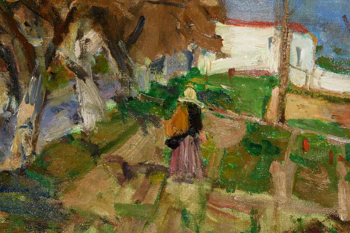 Spätimpressionistisch gemalte Dorflandschaft mit Staffagefigur auf Feldern im Sonnenschein.
