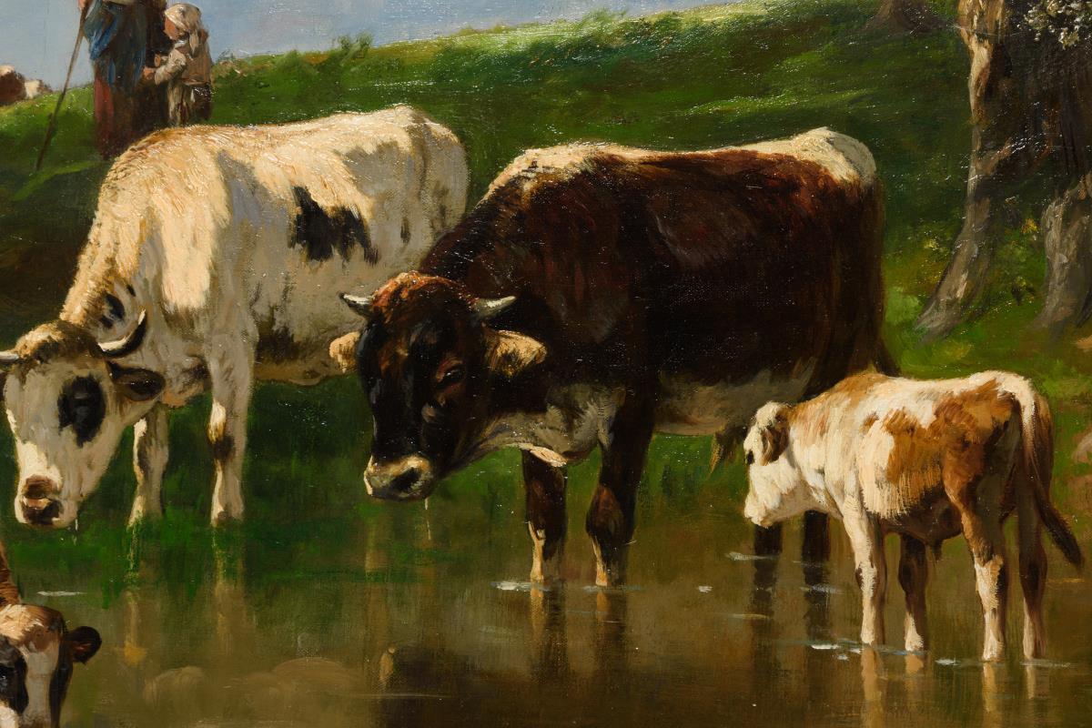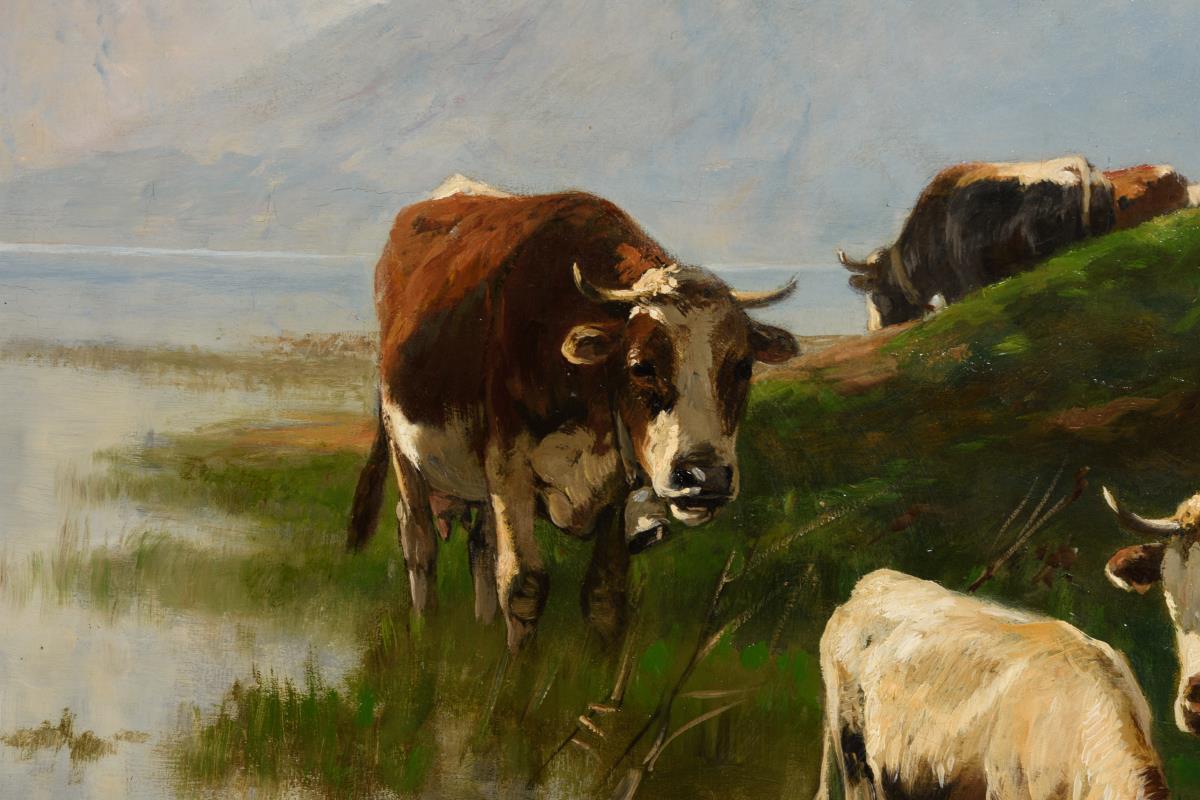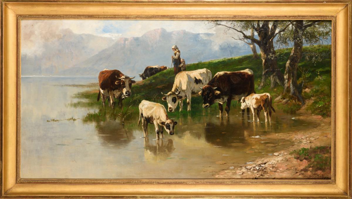 Großes Gemälde Kühe und Hirtin mit Kind am Bergsee.