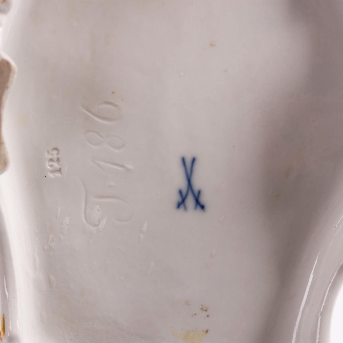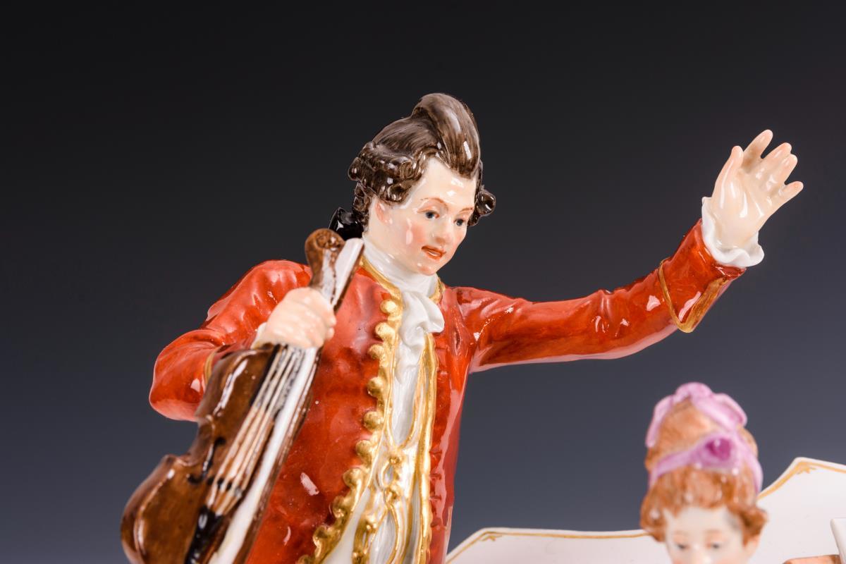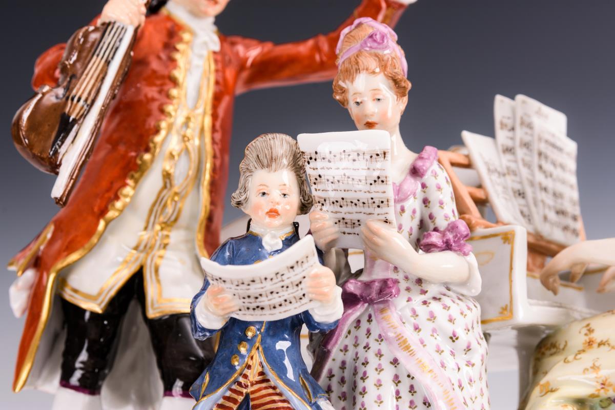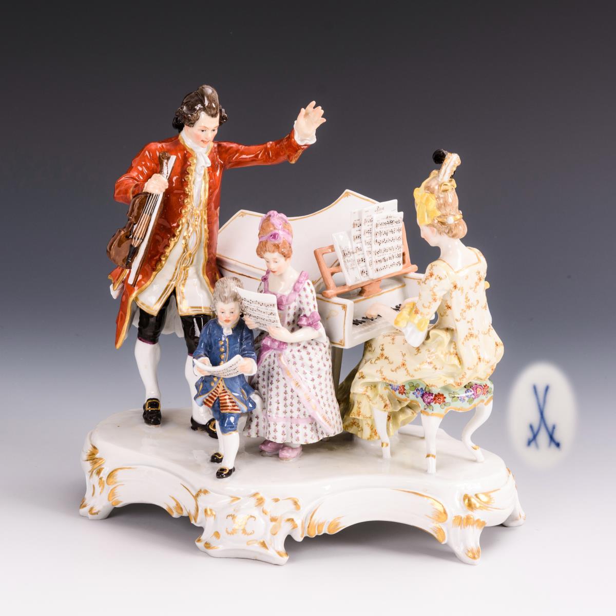 Rokokofamilie beim Musizieren: die Dame am Spinett, der Herr mit Violine sowie singendes Kinderpaar. Kleiner Brandriss an 1 Stuhlbein, Violinenkopf und -bogen restauriert.