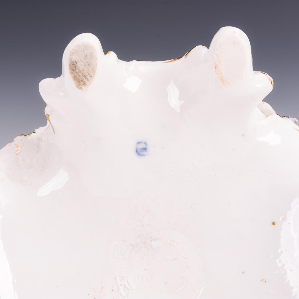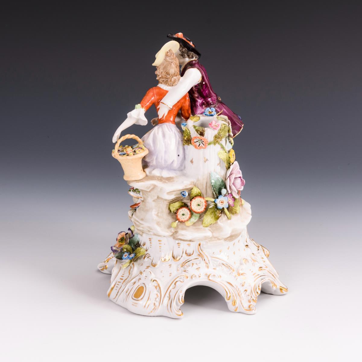Auf einem durchbrochenen, blütenbelegten Rocaillesockel stehendes, in ein Heftchen schauendes Paar mit Lämmern und Blütenkorb. Restaurierung am Sockelrand, an der Jacke des Herren sowie an der Vase, 1 Finger bestoßen.