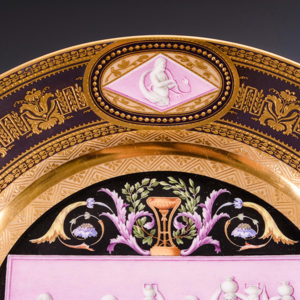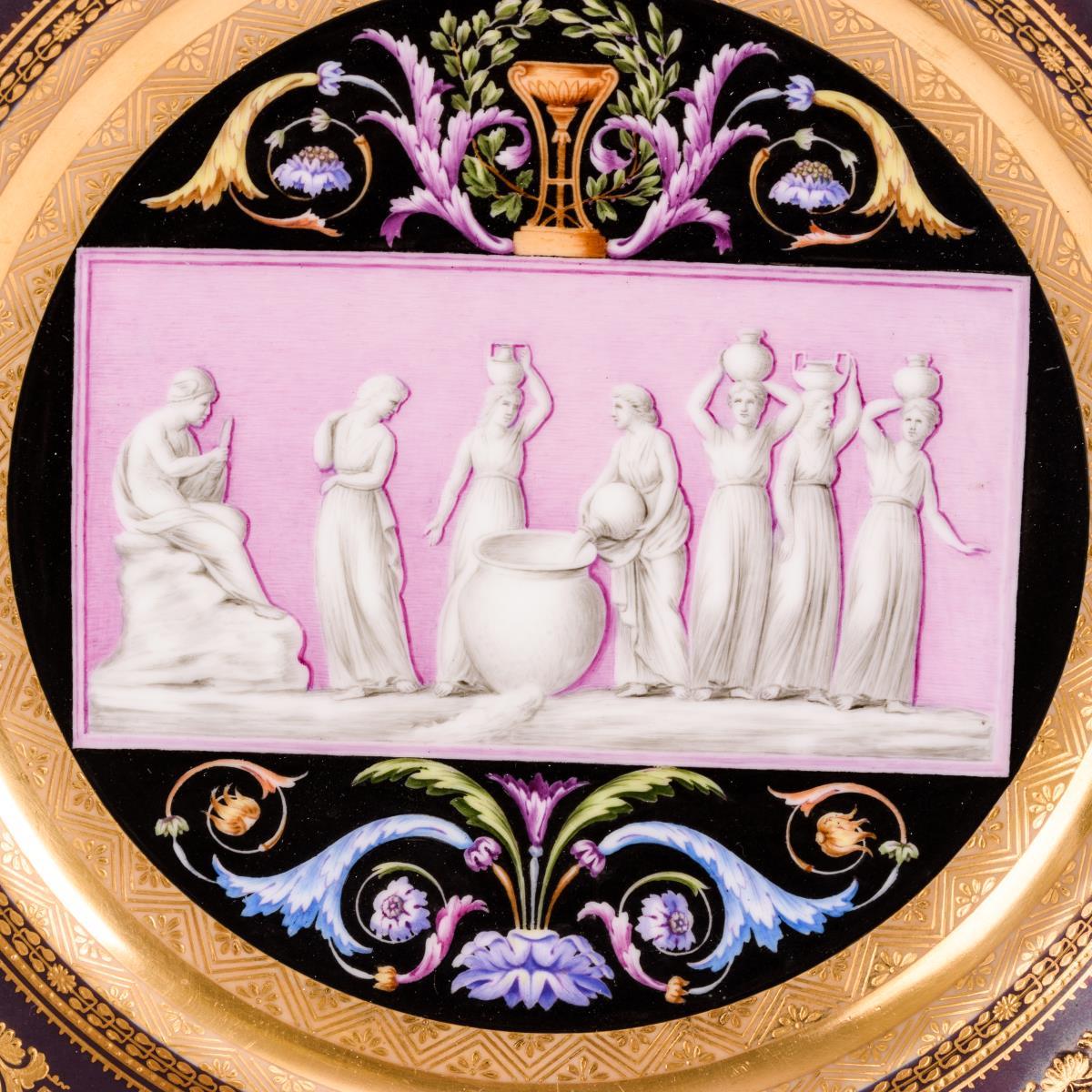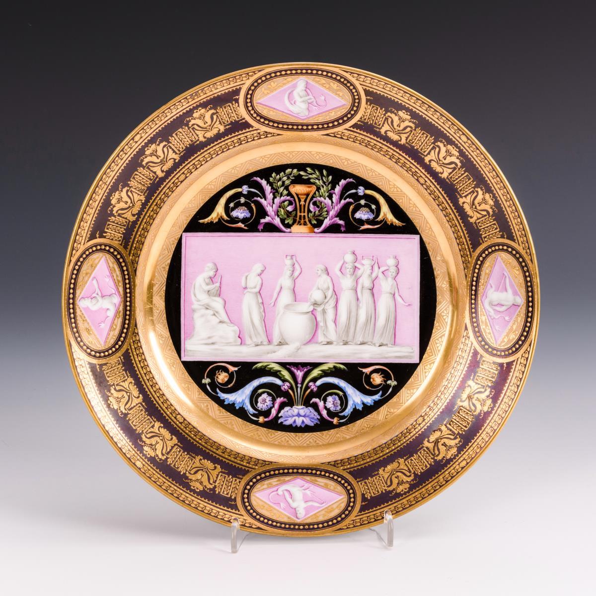 Im Spiegel vor rosa Fond das grisaillegemalte Motiv von antiken Wasserträgerinnen, auf der Fahne reiche ornamentale Goldreliefmalerei auf braunem Fond sowie vier Ovalkartuschen mit Figurenmalerei.