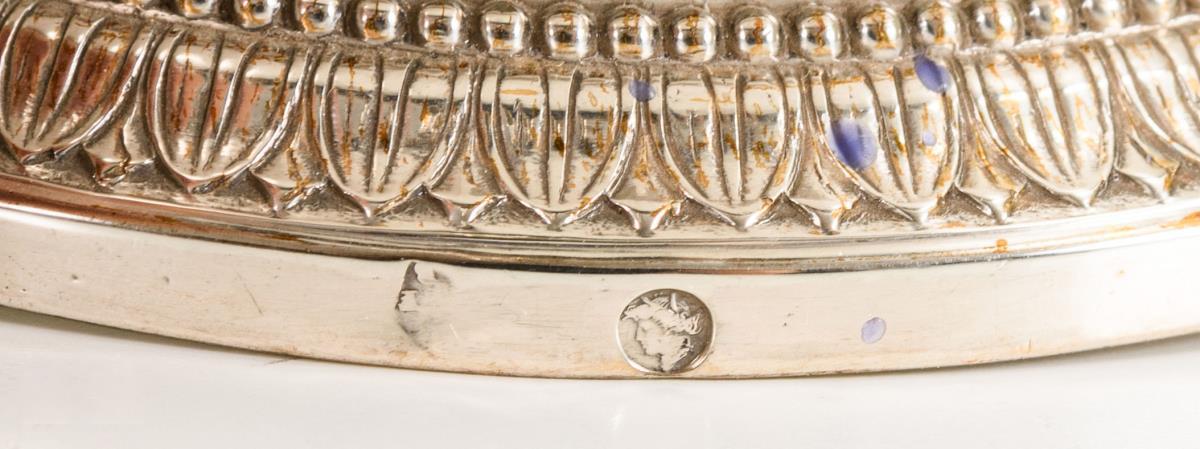 Im Empire-Stil gestaltet, mit 2 aufgelegten Medaillons, teils durchbrochen gearbeitetetem Fuß und Füllhorn-Henkeln. Kleine Dellen, mehrere Lötstellen.