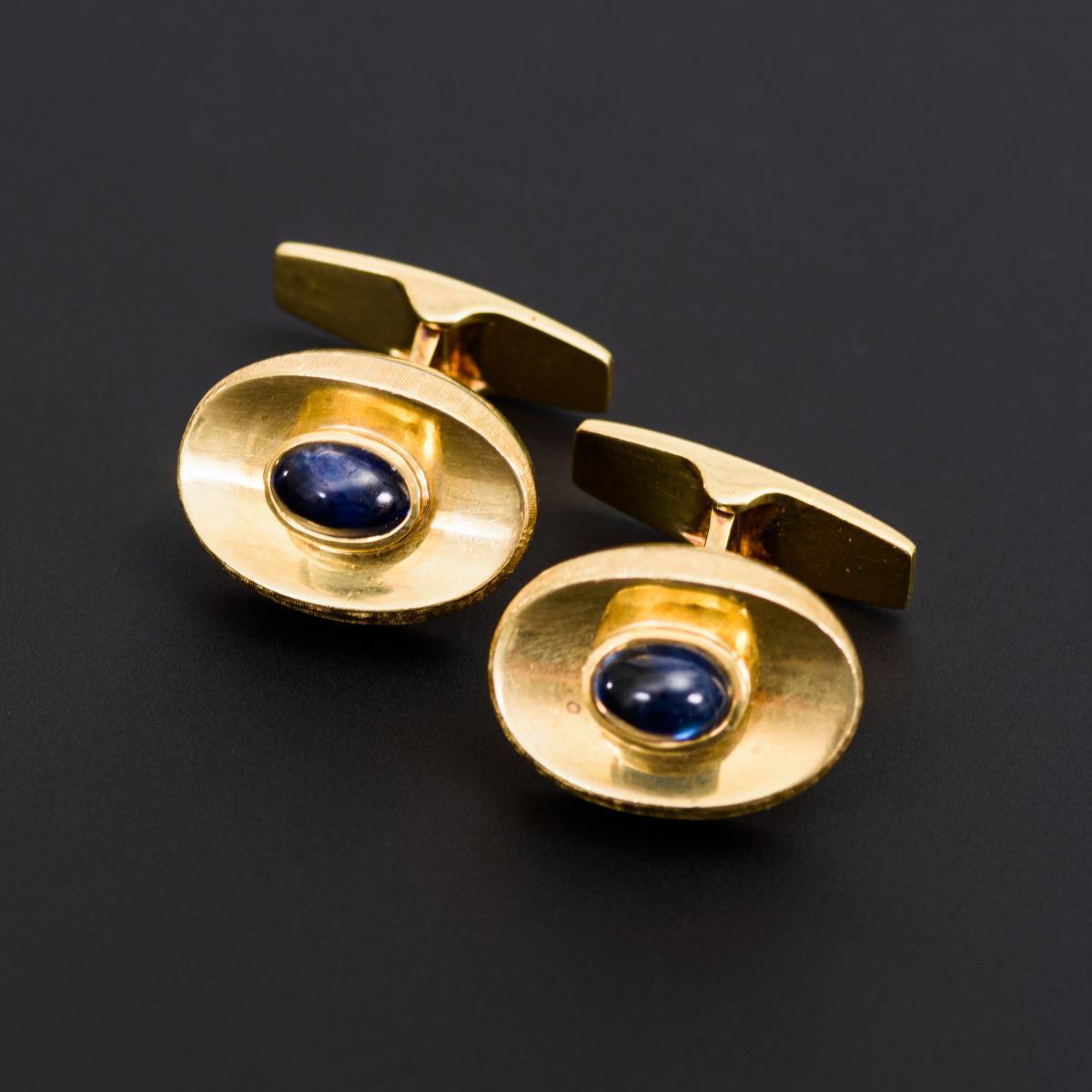 Solide Manschettenknöpfe mit zargengefassten Saphircabochons. Kippknebel.