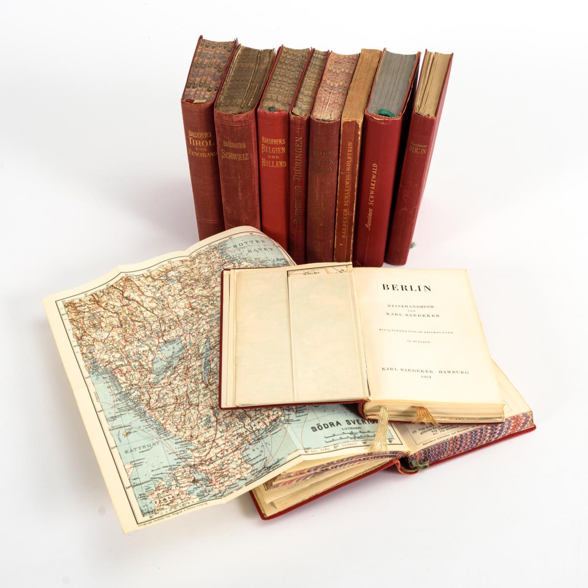 "Thüringen, Provinz Sachsen, südlicher Teil Leipzig, Kassel, Hannover, Bamberg, Würzburg" 1920 / "Die Rheinlande von der elsässischen bis zur holländischen Grenze, Rheinpfalz und Saargebiet, Rhein.-Westfälisches Industriegebiet" 1931 / "Schleswig-Holstein und Hamburg" 1949, Broschur / "Schwarzwald, Odenwald, Neckartal" 1956 / 2x "Berlin" 1954 / "Schweden und Finnland und die Hauptreisewege durch Dänemark" 1929 / "Tirol, Vorarlberg, Etschland, westliche Teile von Salzburg und von Kärnten" 1929 / "Die Schweiz nebst den angrenzenden Teilen von Oberitalien, Savoyen und Tirol" 1913 / "Belgien und Holland nebst Luxemburg" 1910. Alle mit Karte, leichte Gebrauchsspuren.